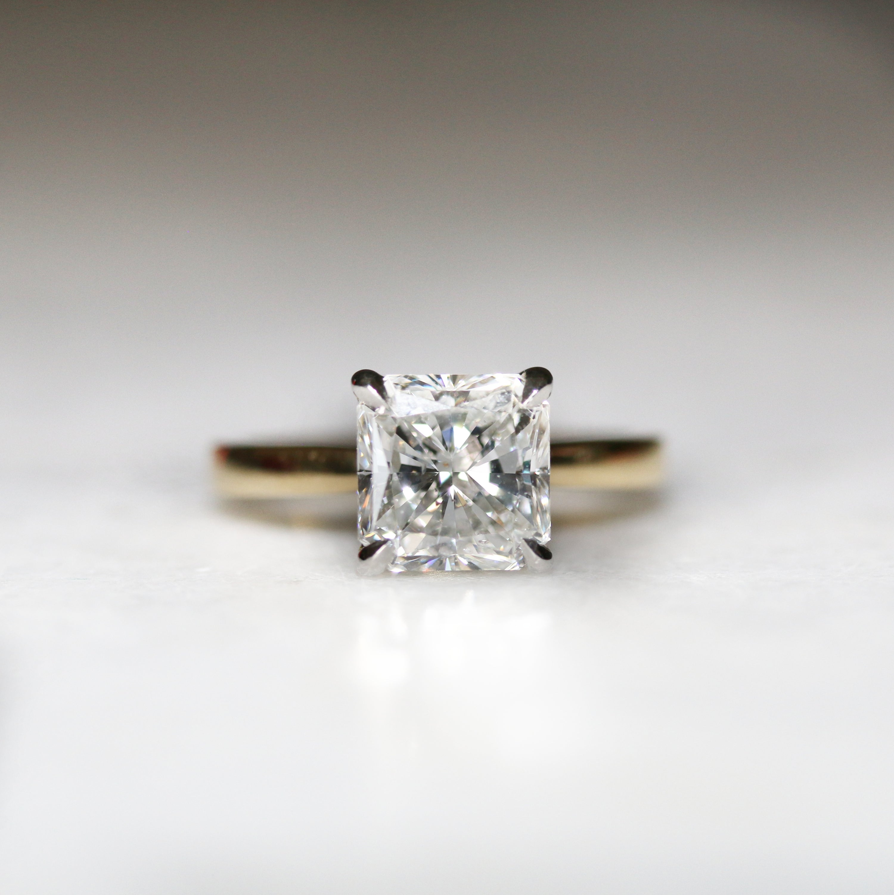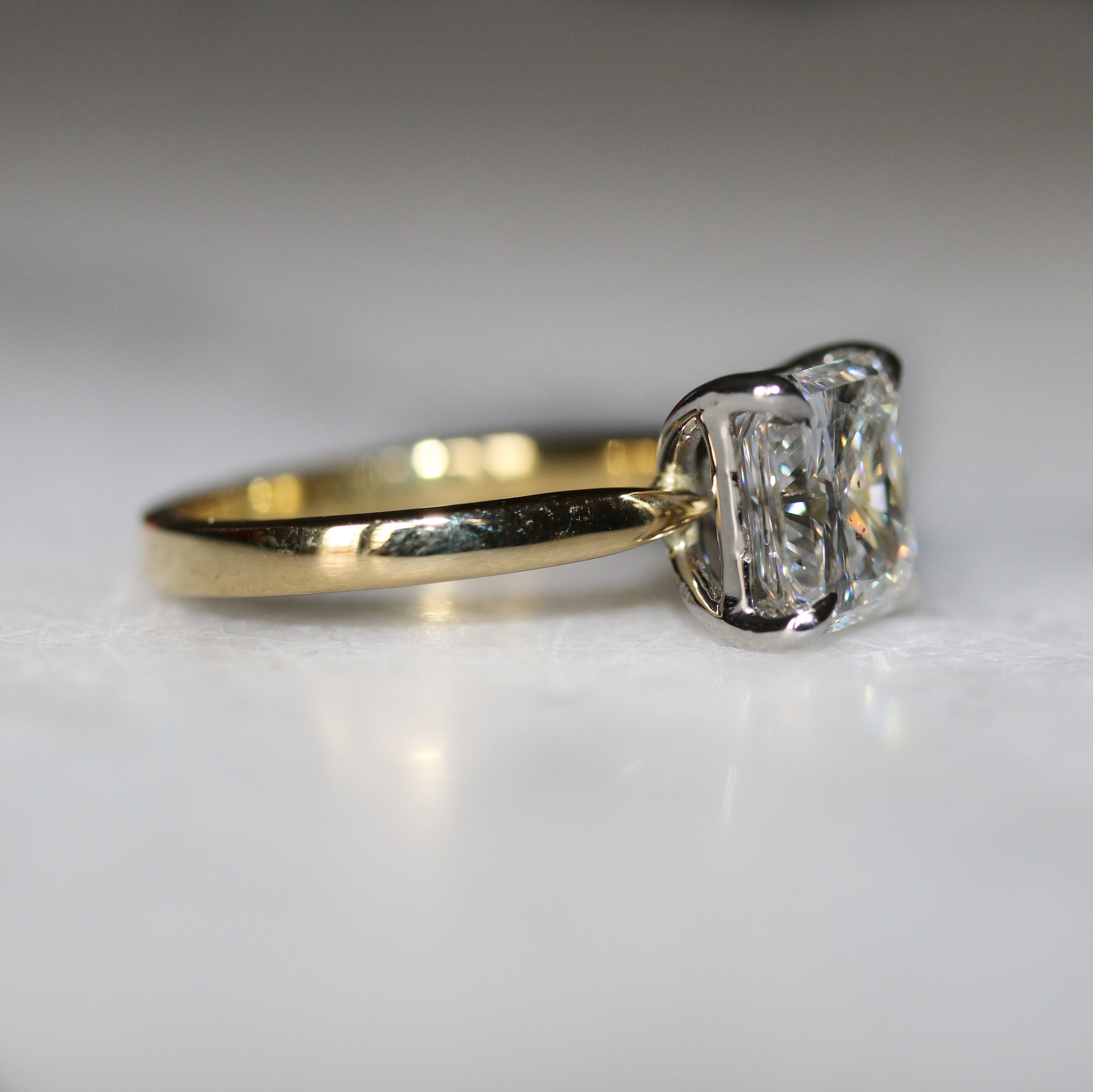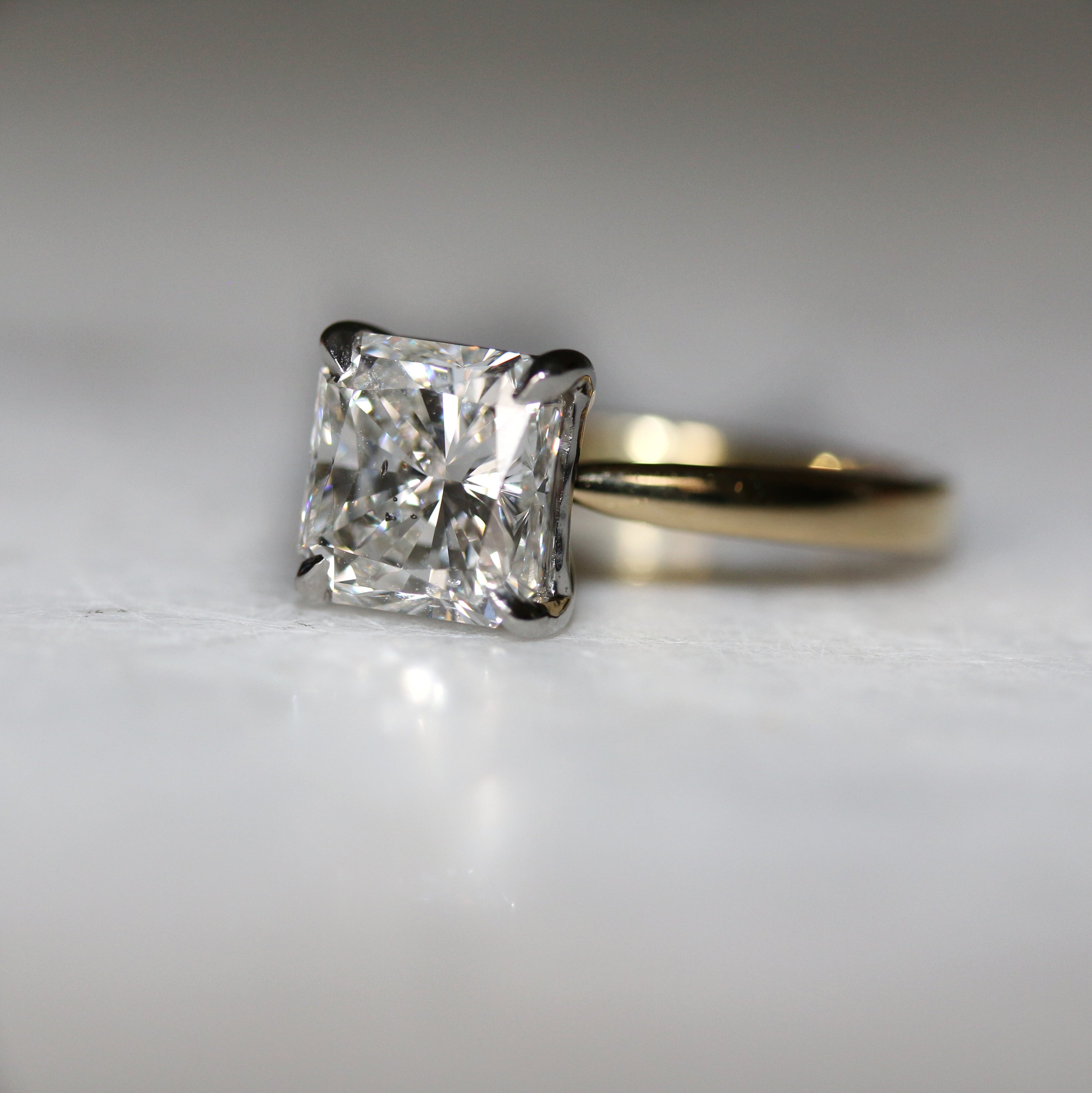 Elevate your elegance with this exceptional 3.03ct radiant cut diamond solitaire, masterfully set in a luxurious blend of platinum and 18ct yellow gold. The H/SI2 quality stone delivers brilliant sparkle with remarkable clarity, while the sophisticated two-tone shank creates a timeless aesthetic that complements any style. A true investment piece that captures light beautifully and makes an unforgettable statement.