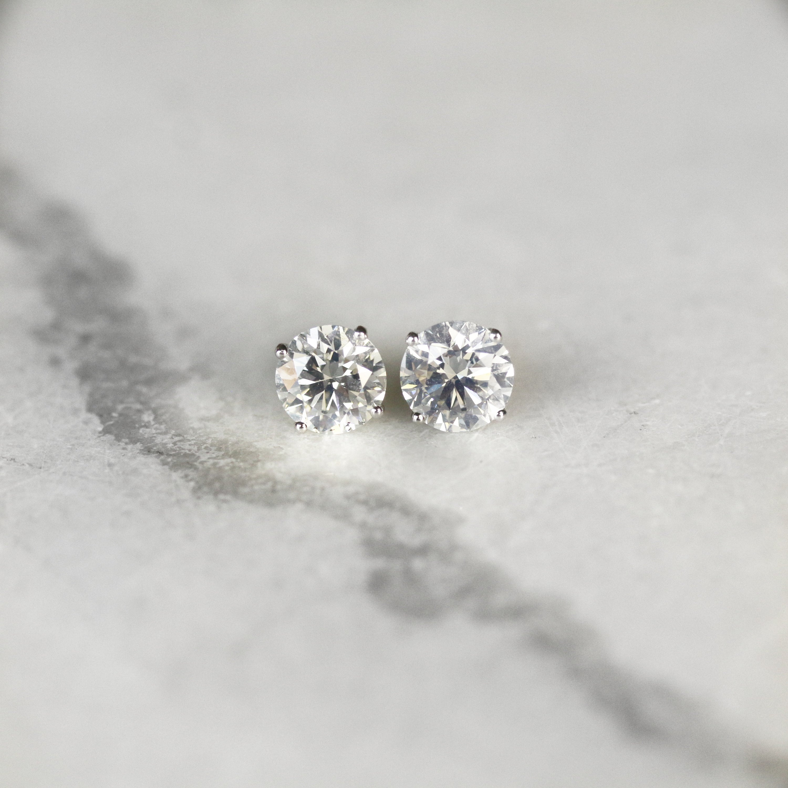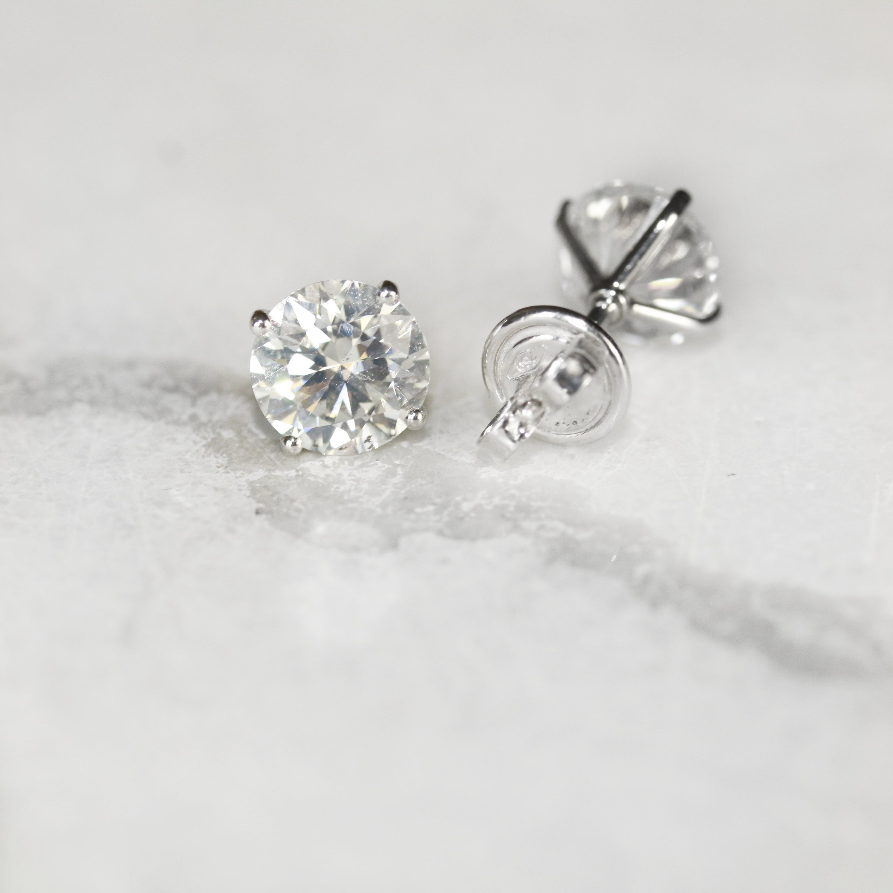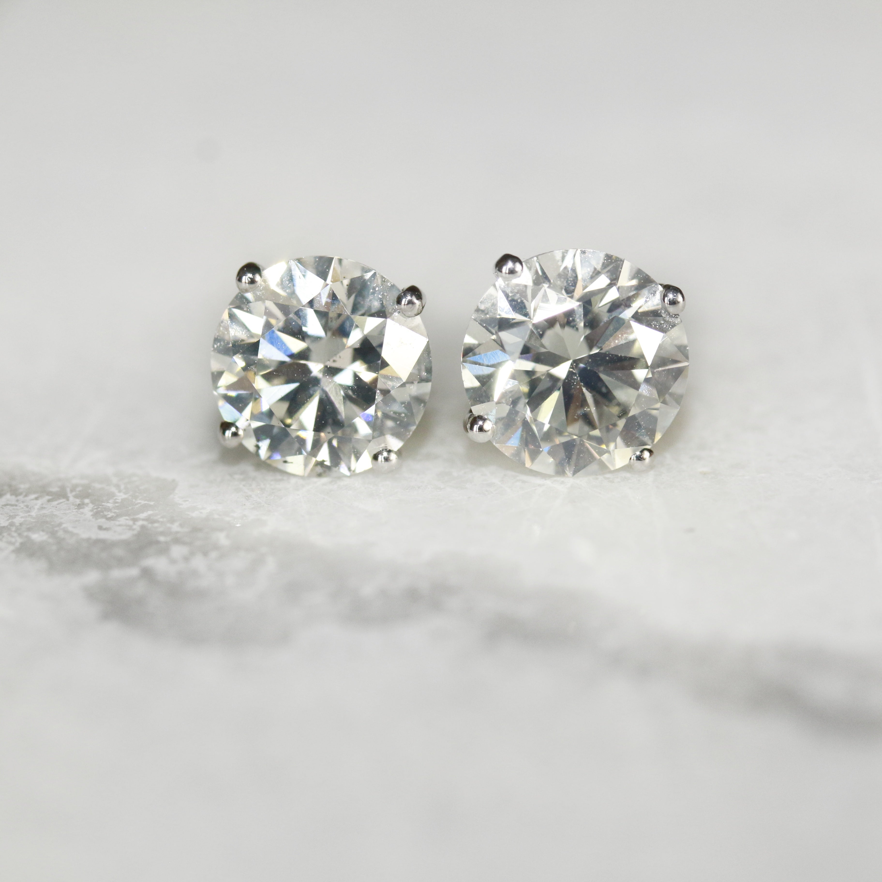 A pair of 18ct white gold diamond stud earrings featuring round brilliant cut diamonds totalling 3.22ct in claw settings with post and scroll backs.