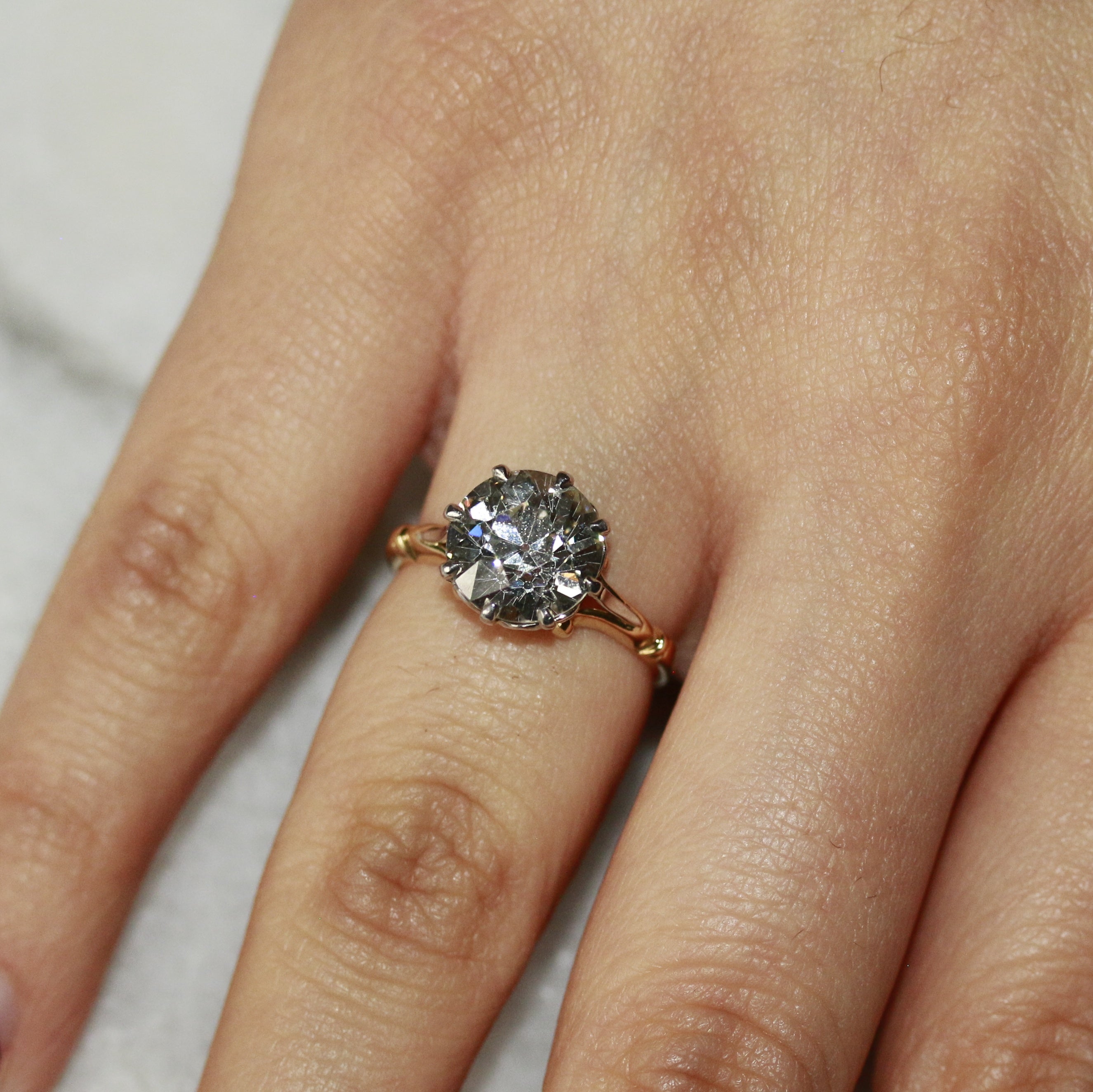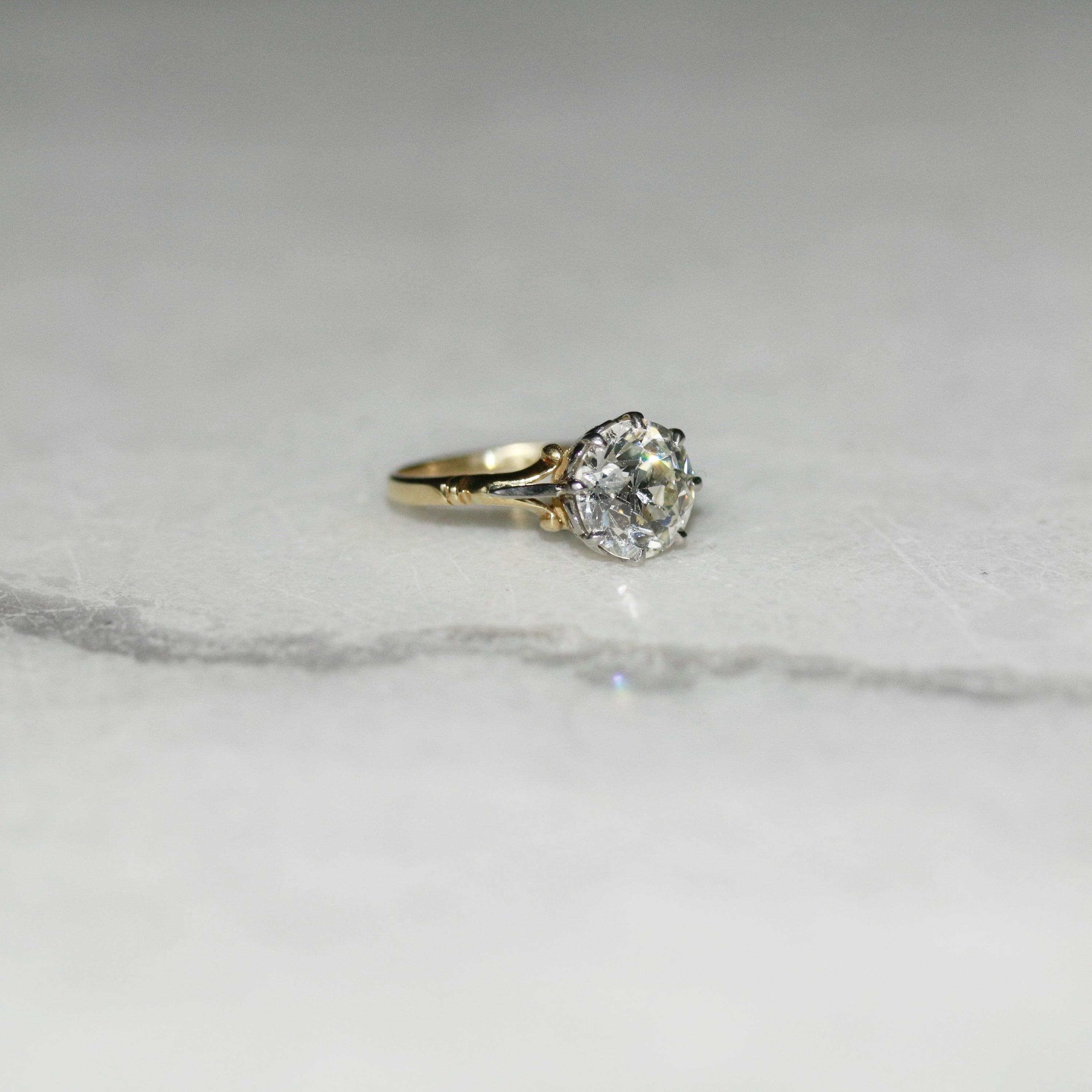 A striking 3.25ct old European cut diamond in J colour, SI1 clarity, set in a refined yellow gold and platinum mounting. This antique solitaire captures the romantic allure of classic diamond cutting whilst offering substantial presence and prestige.