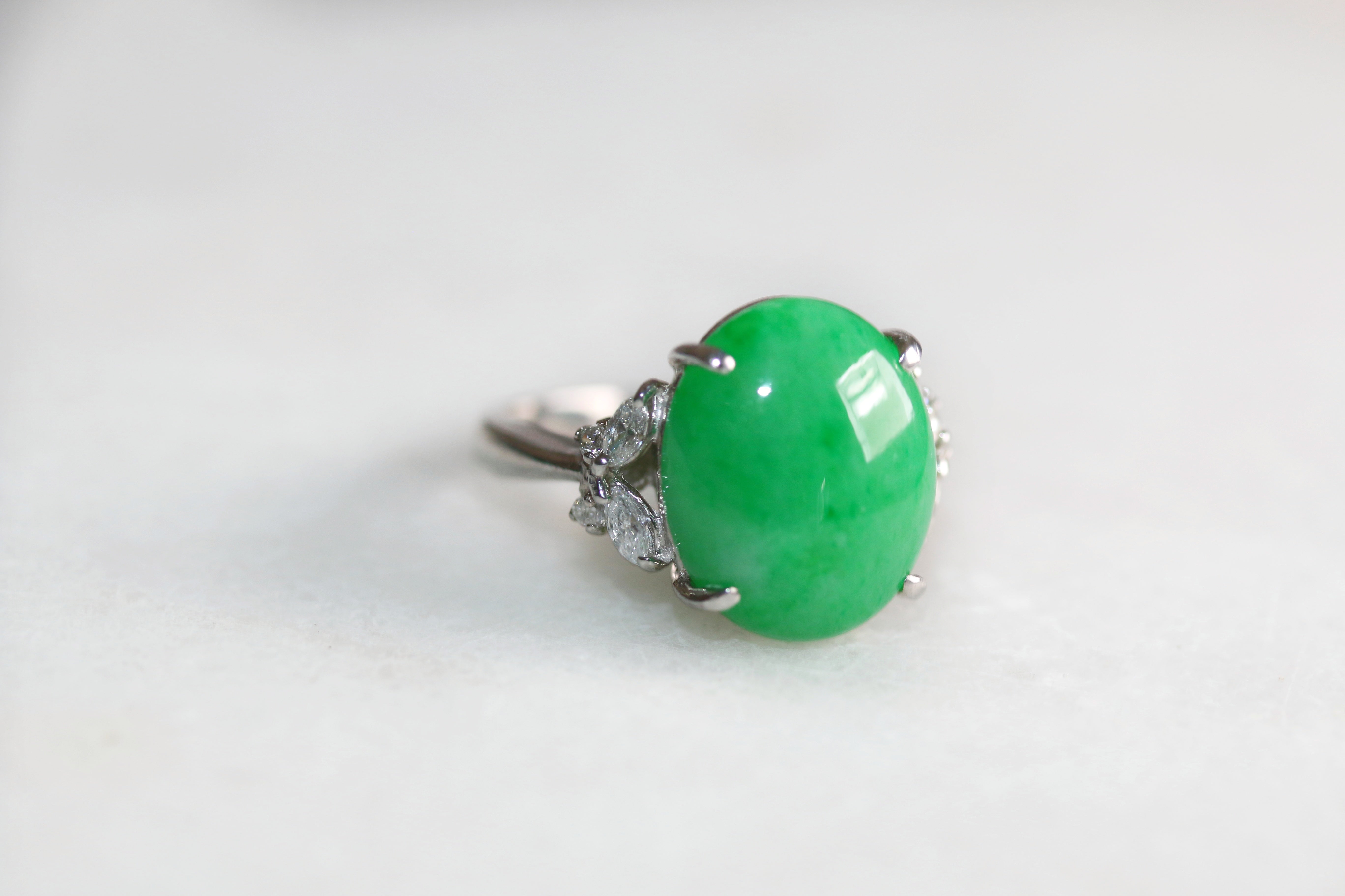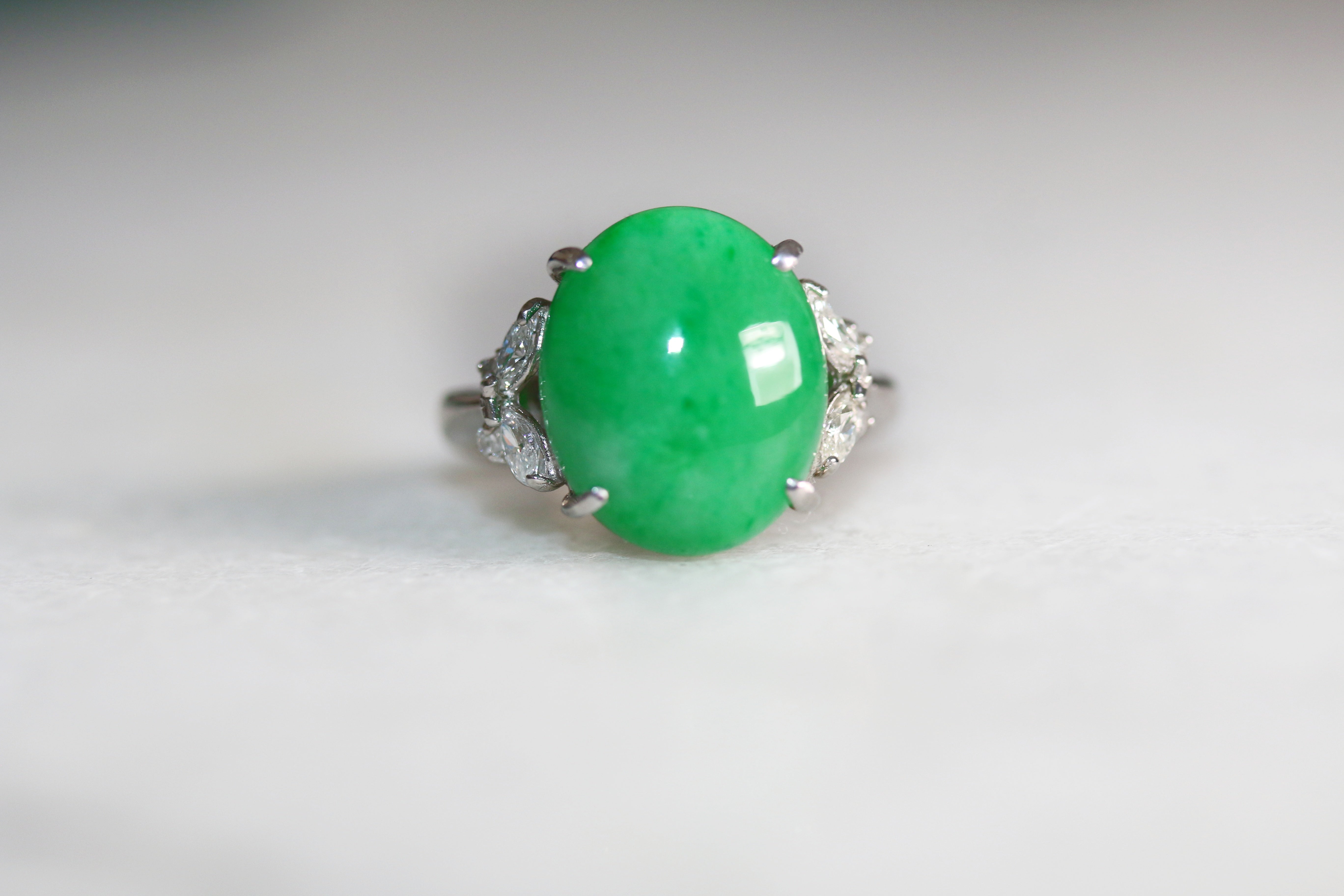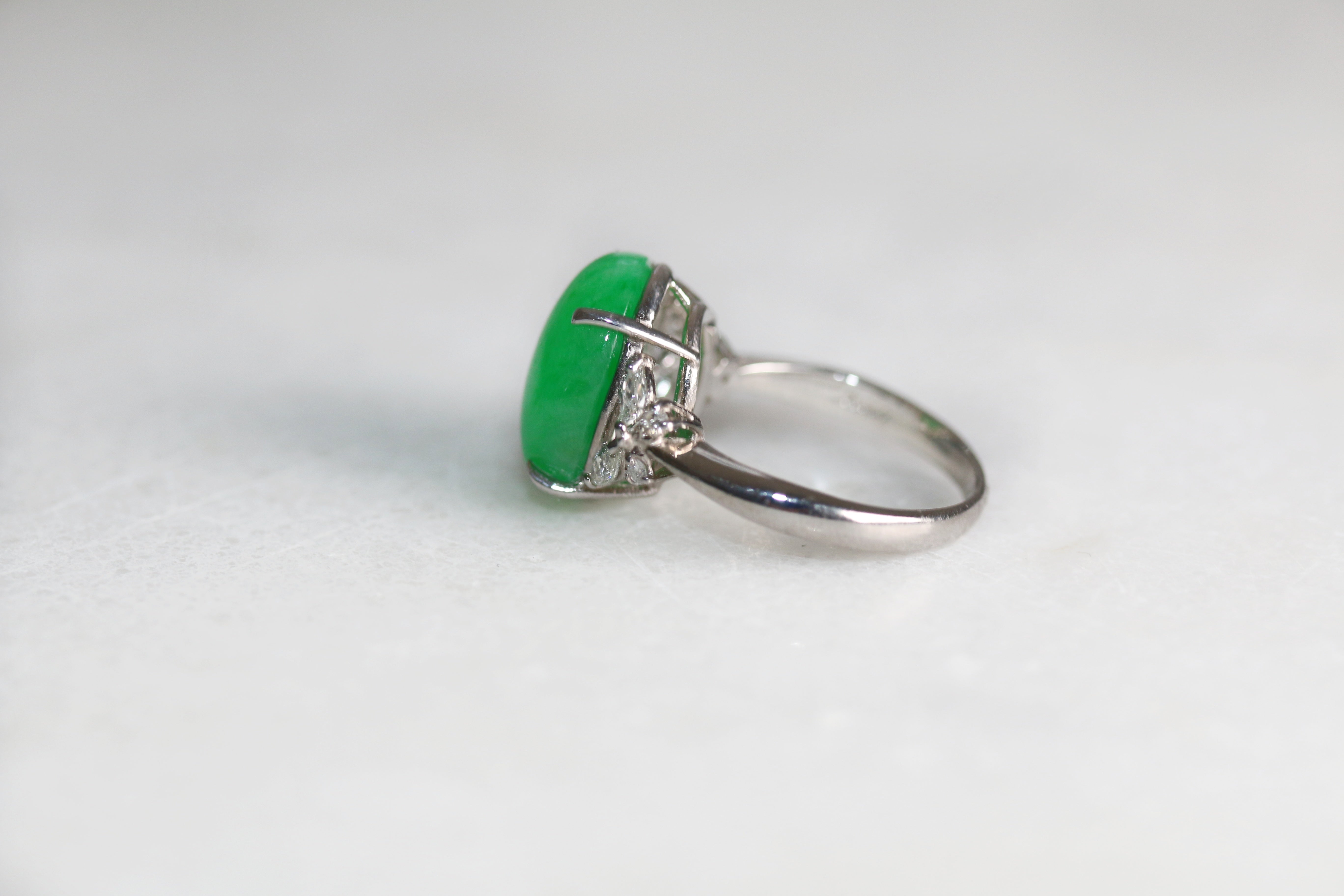 This exquisite dress ring features a 9.60ct jade centrepiece set in platinum, complemented by 0.29ct of butterfly-shaped diamonds adorning the shoulders for a refined and elegant look.