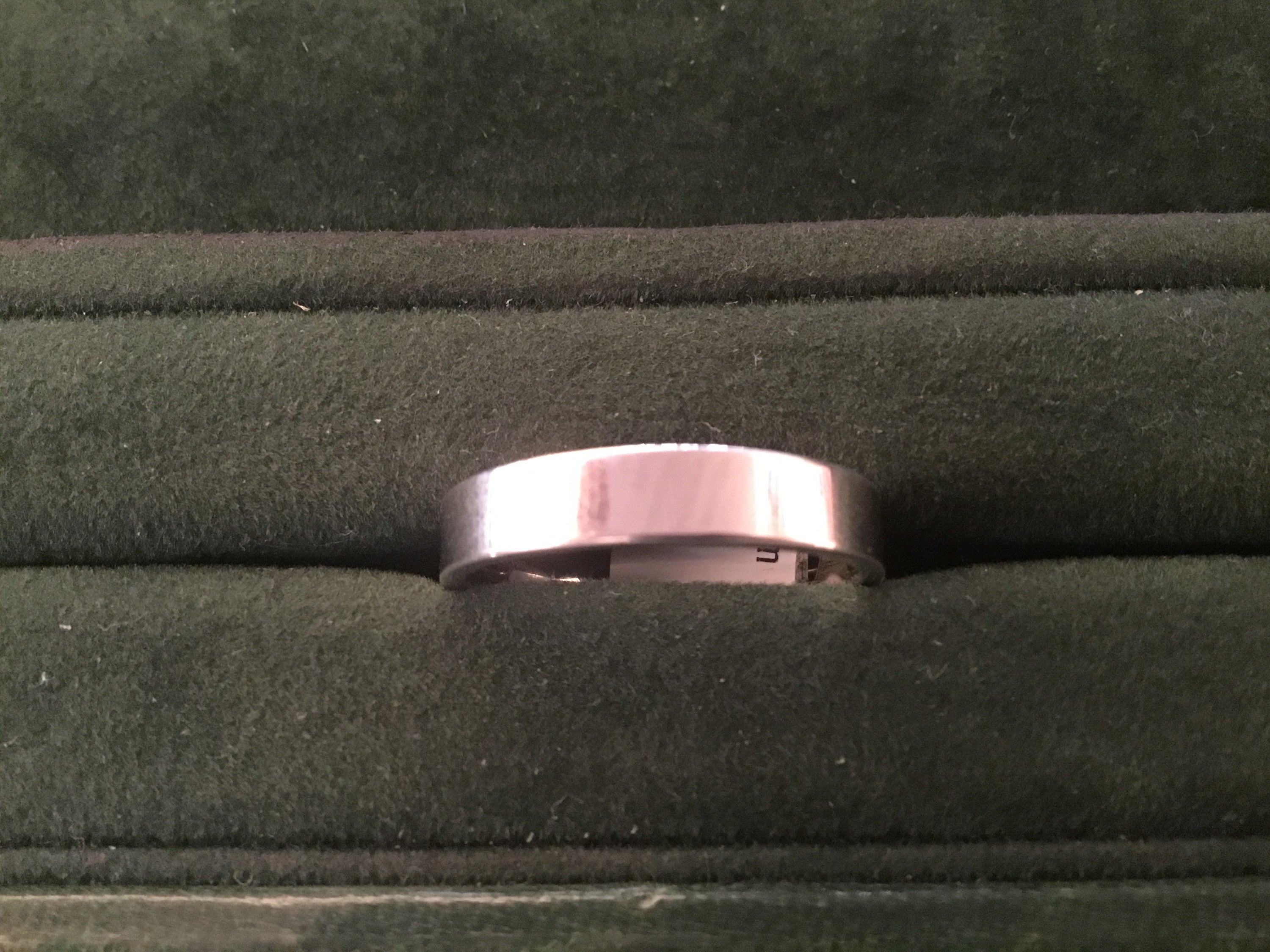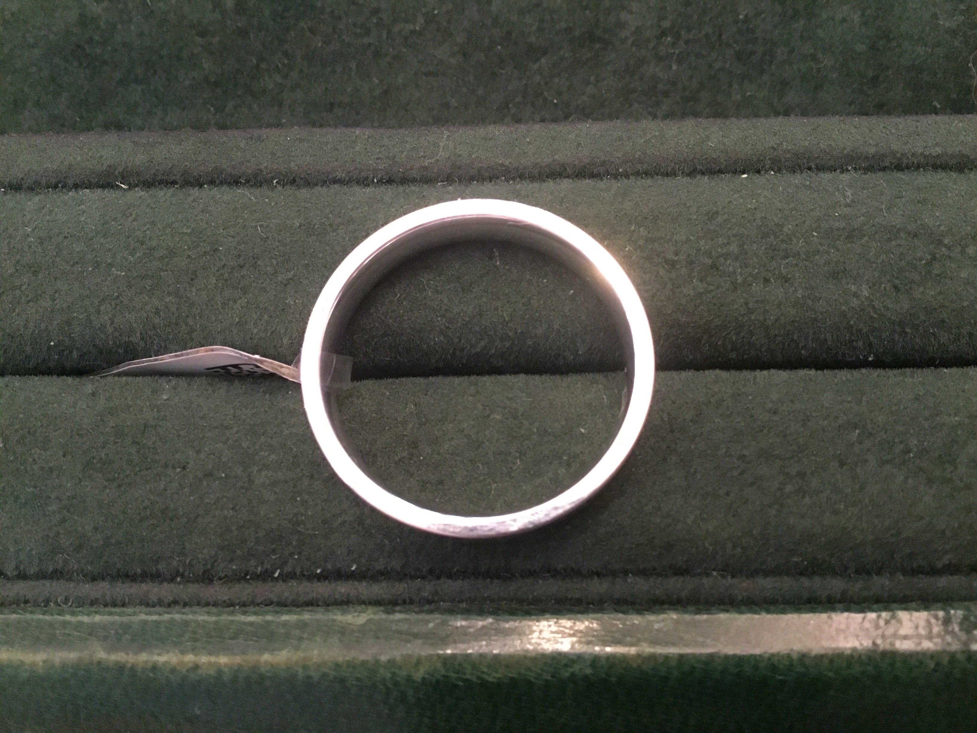 A 9ct white gold flat shaped wedding band with a width of 4mm.