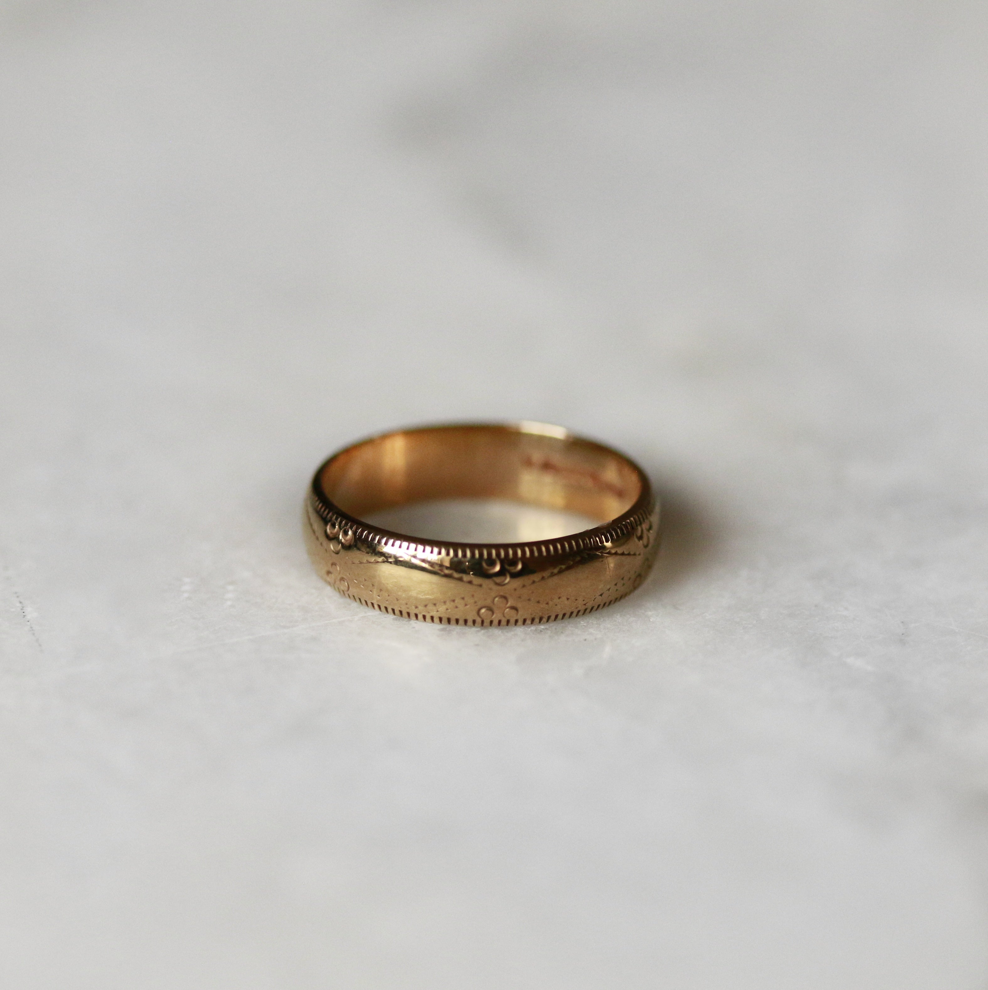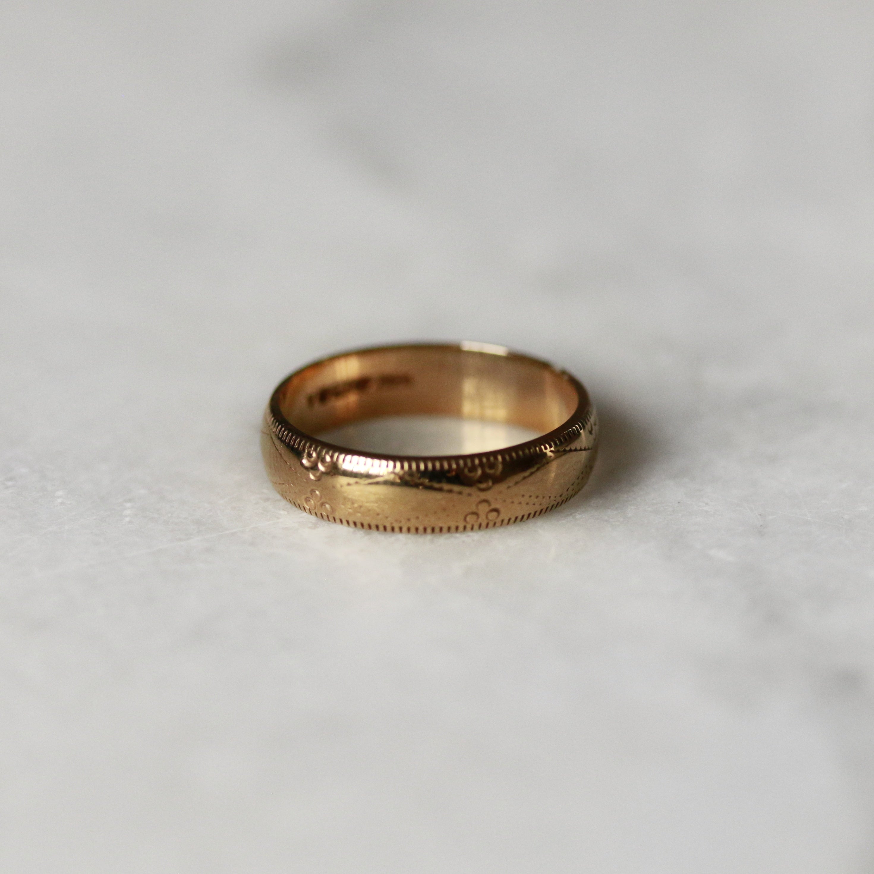 A 9ct yellow gold D-Shaped wedding band with engraved detailing and a beaded edge finish measuring approximately 4mm in width.