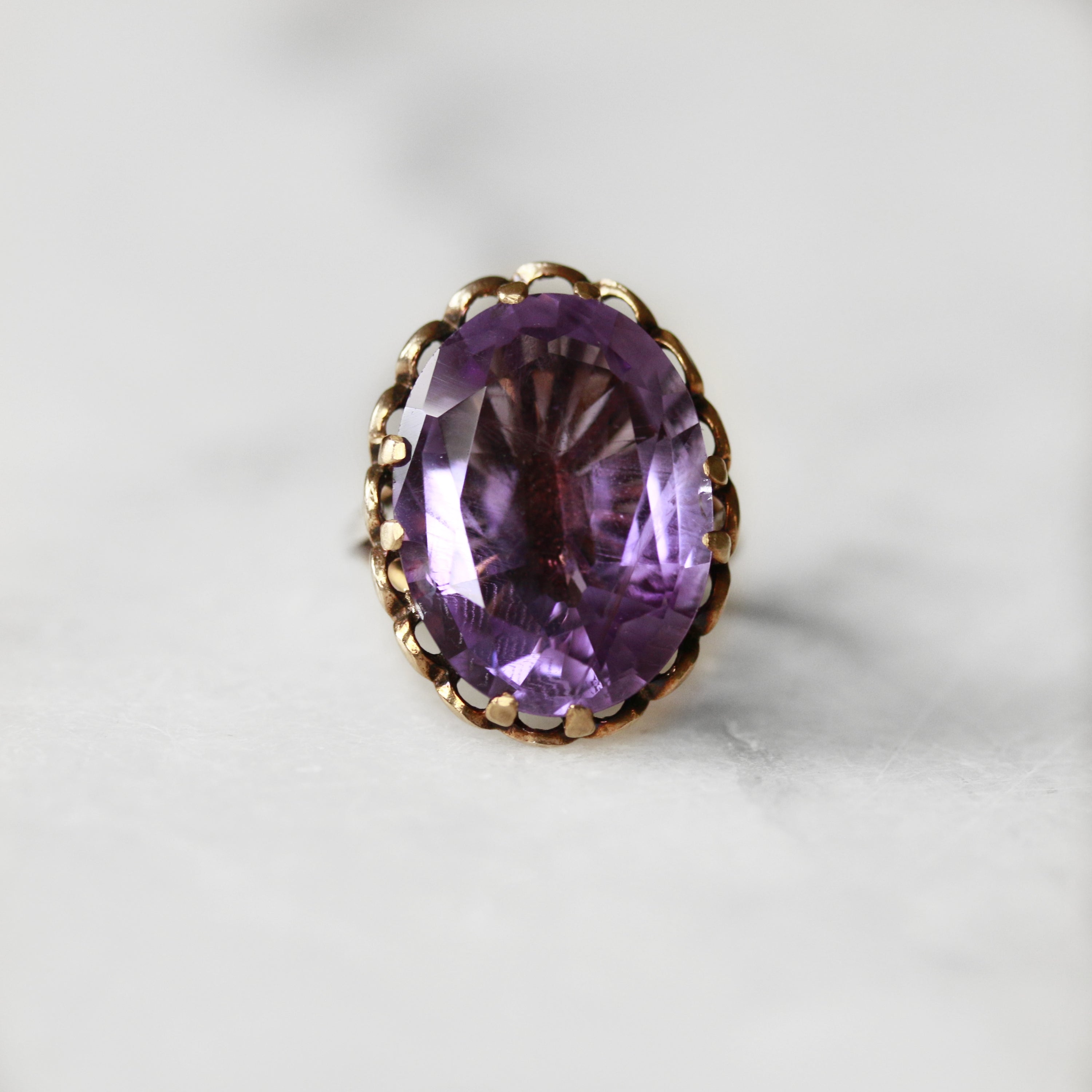 This elegant dress ring showcases a striking oval-cut amethyst stone, secured in a sophisticated claw setting that allows light to dance through the gemstone. The 9ct yellow gold band features intricate pierced detailing beneath the stone, adding depth and visual interest to the design.