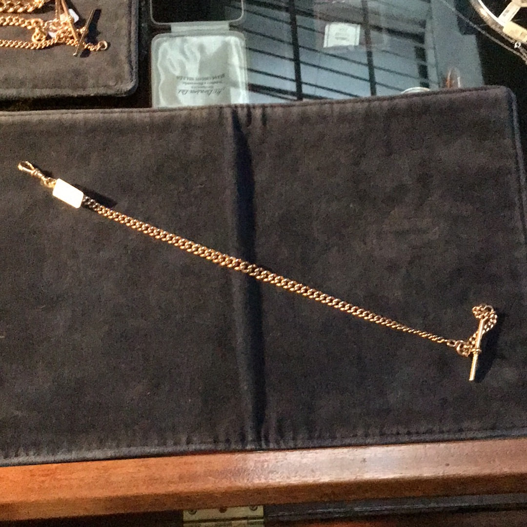 An antique 9ct rose gold Albert chain necklace featuring a T-Bar and rounded curb links.