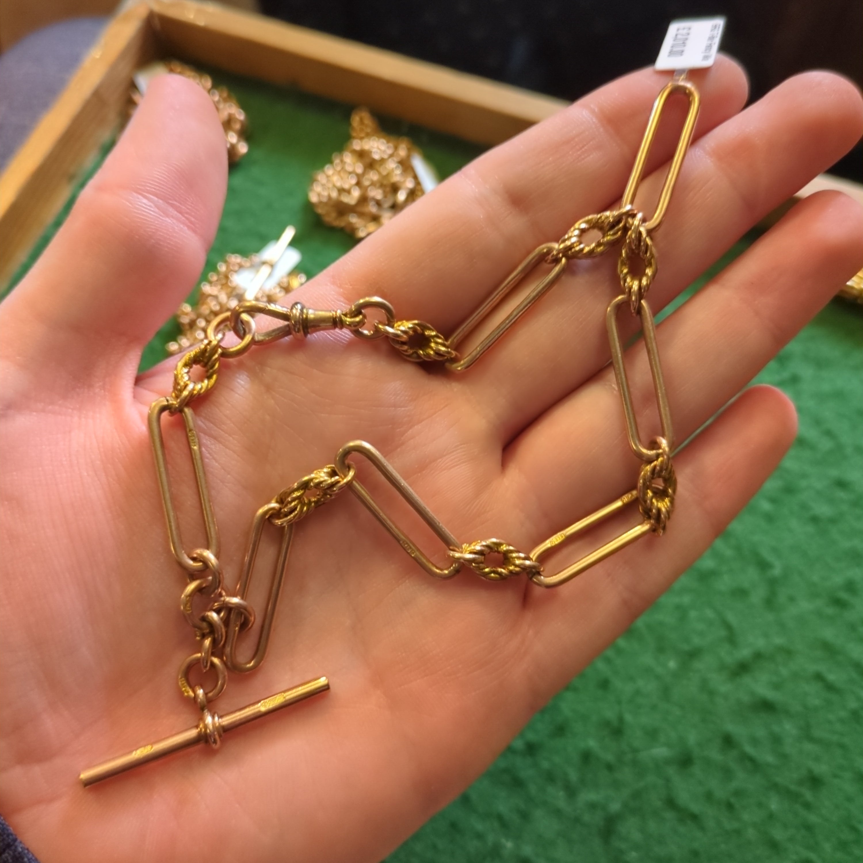 A 9ct rose gold fancy link albert chain with solid, individually stamped links measuring approximately 14" in length.