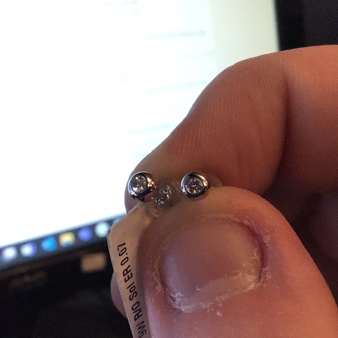 A pair of 9ct white gold diamond solitaire stud earrings with a rub over setting and standard post and scroll fittings.
