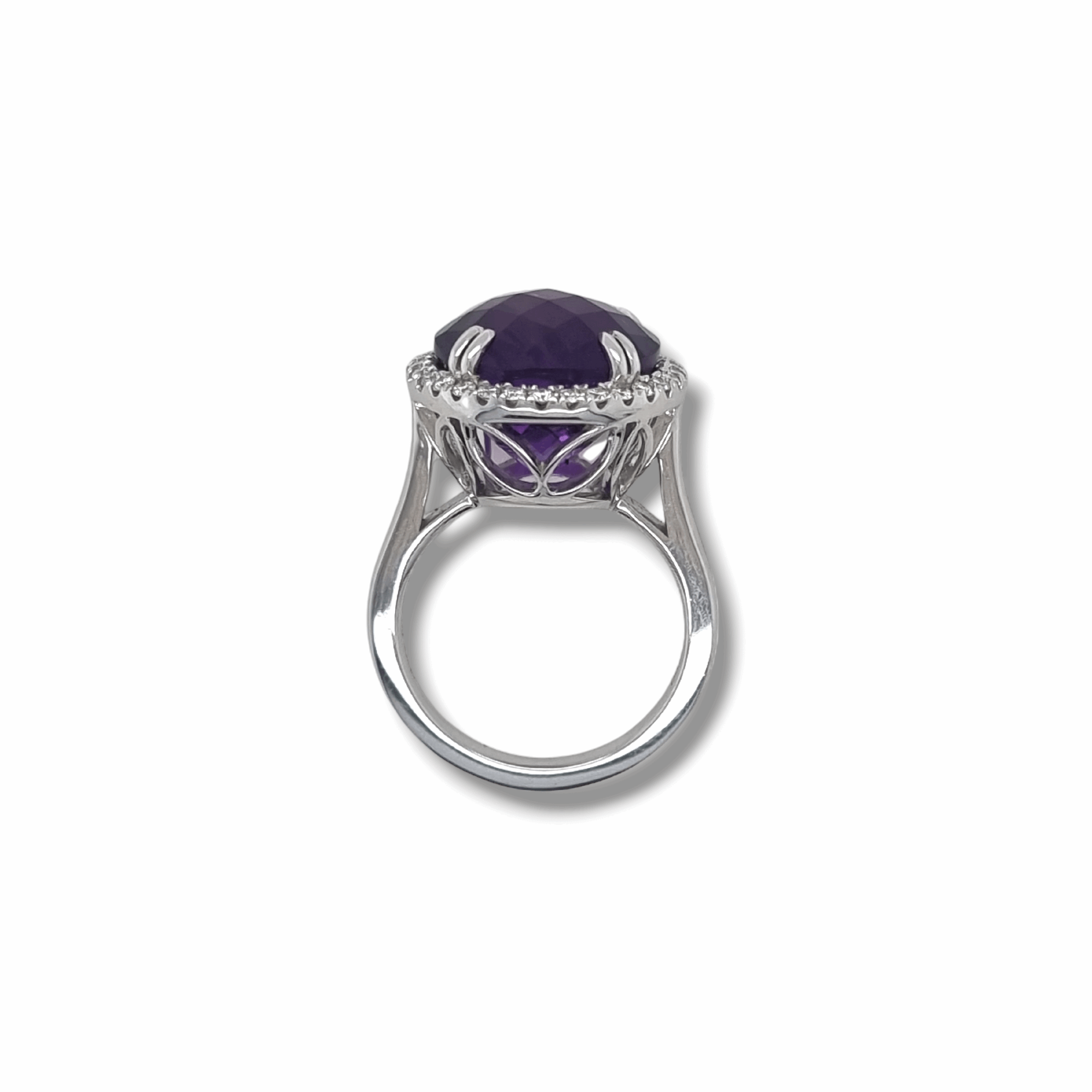 A stunning dress ring featuring a 9.38ct checkerboard amethyst within a halo of round brilliant diamonds, crafted in 18ct white gold.