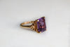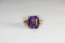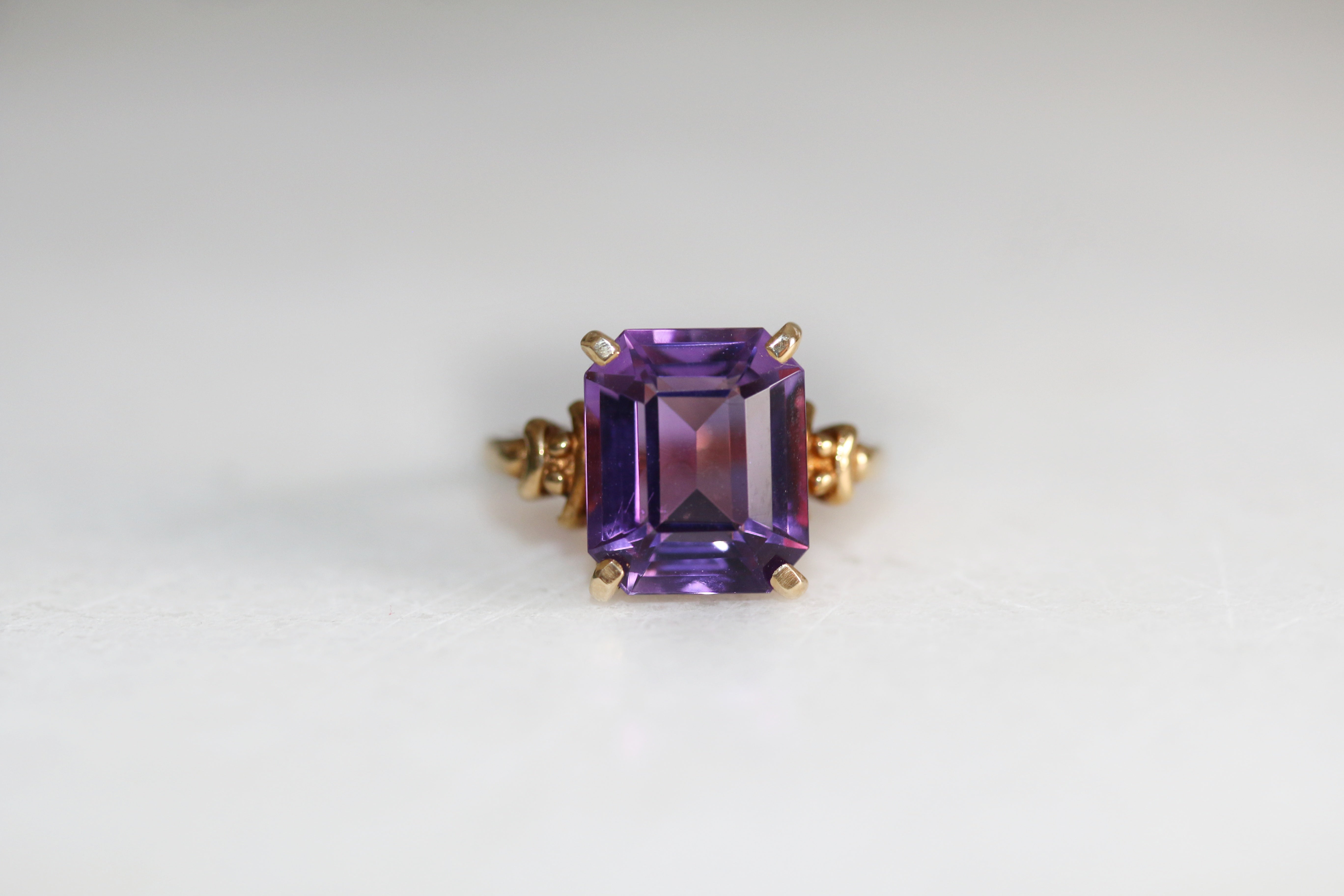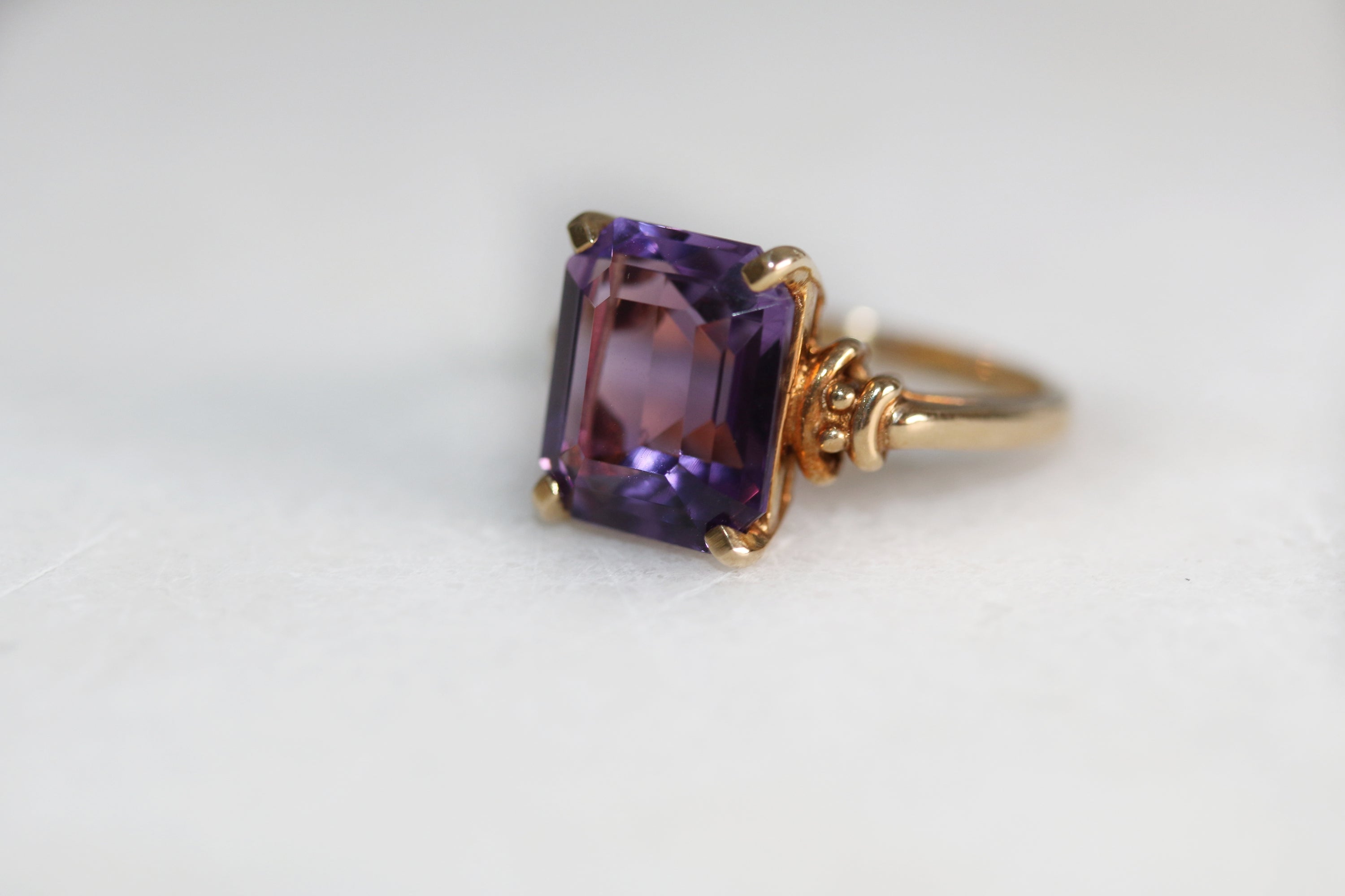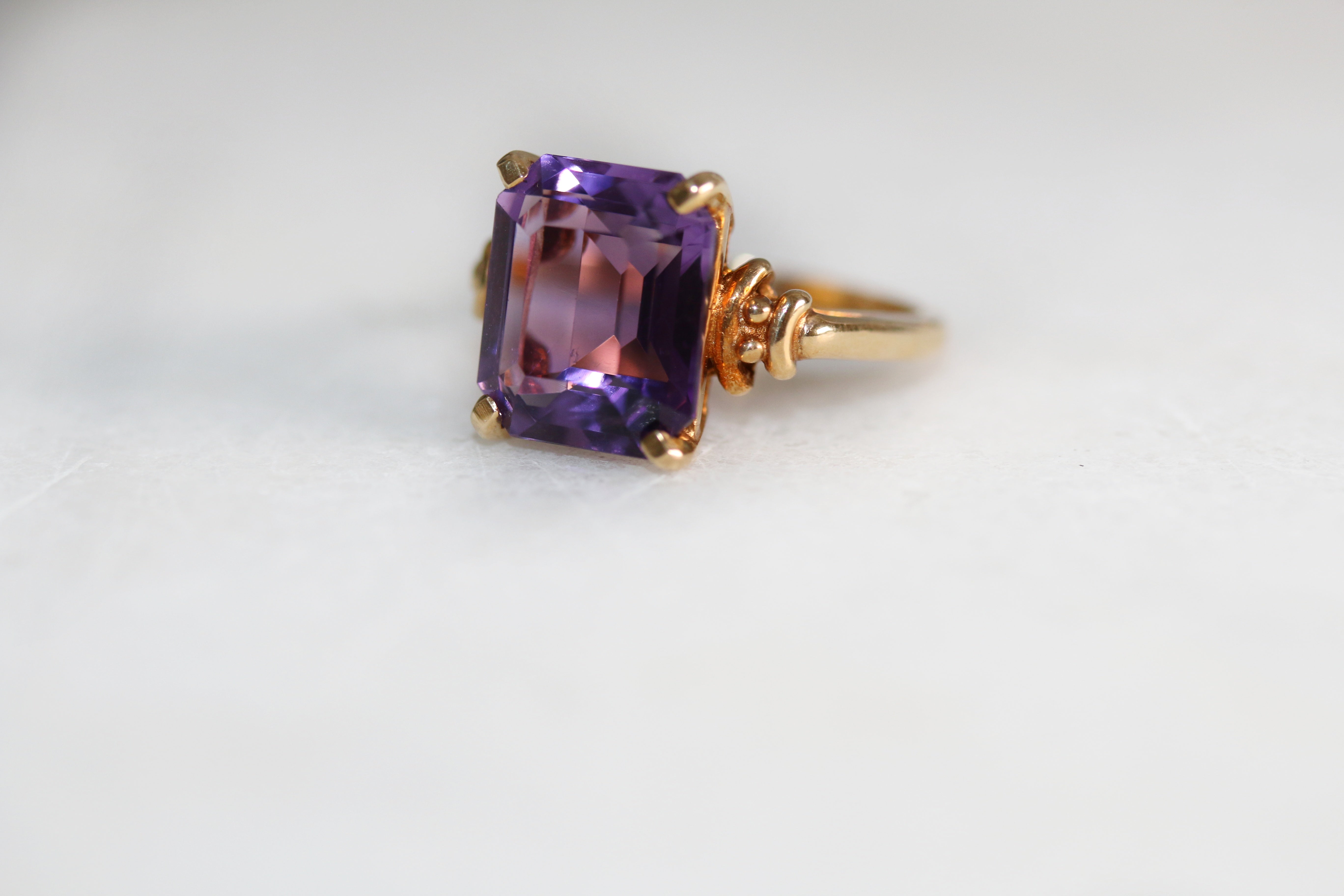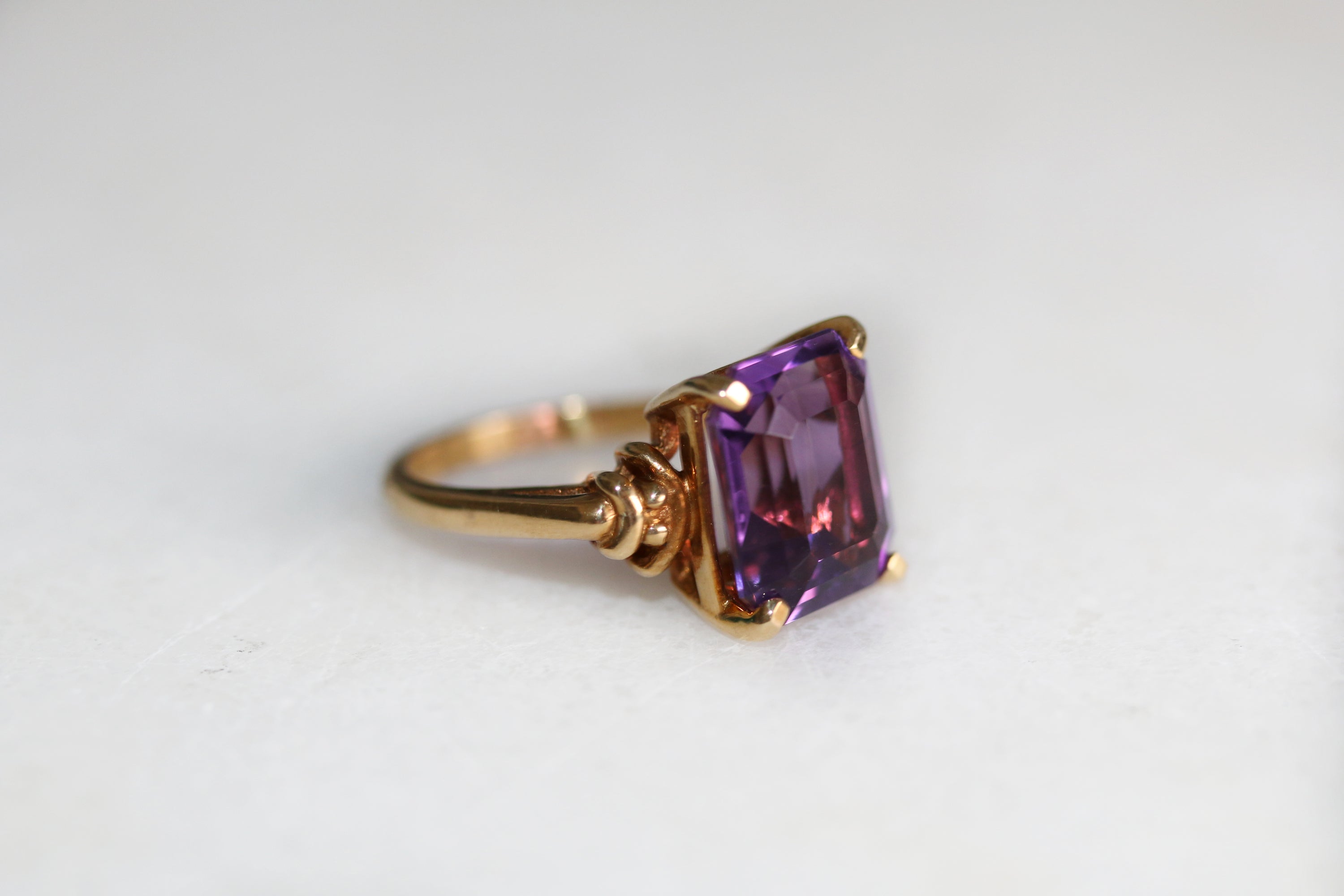 This 9ct gold dress ring features a striking rectangular amethyst, expertly crafted to enhance its vibrant colour and elegant design.