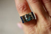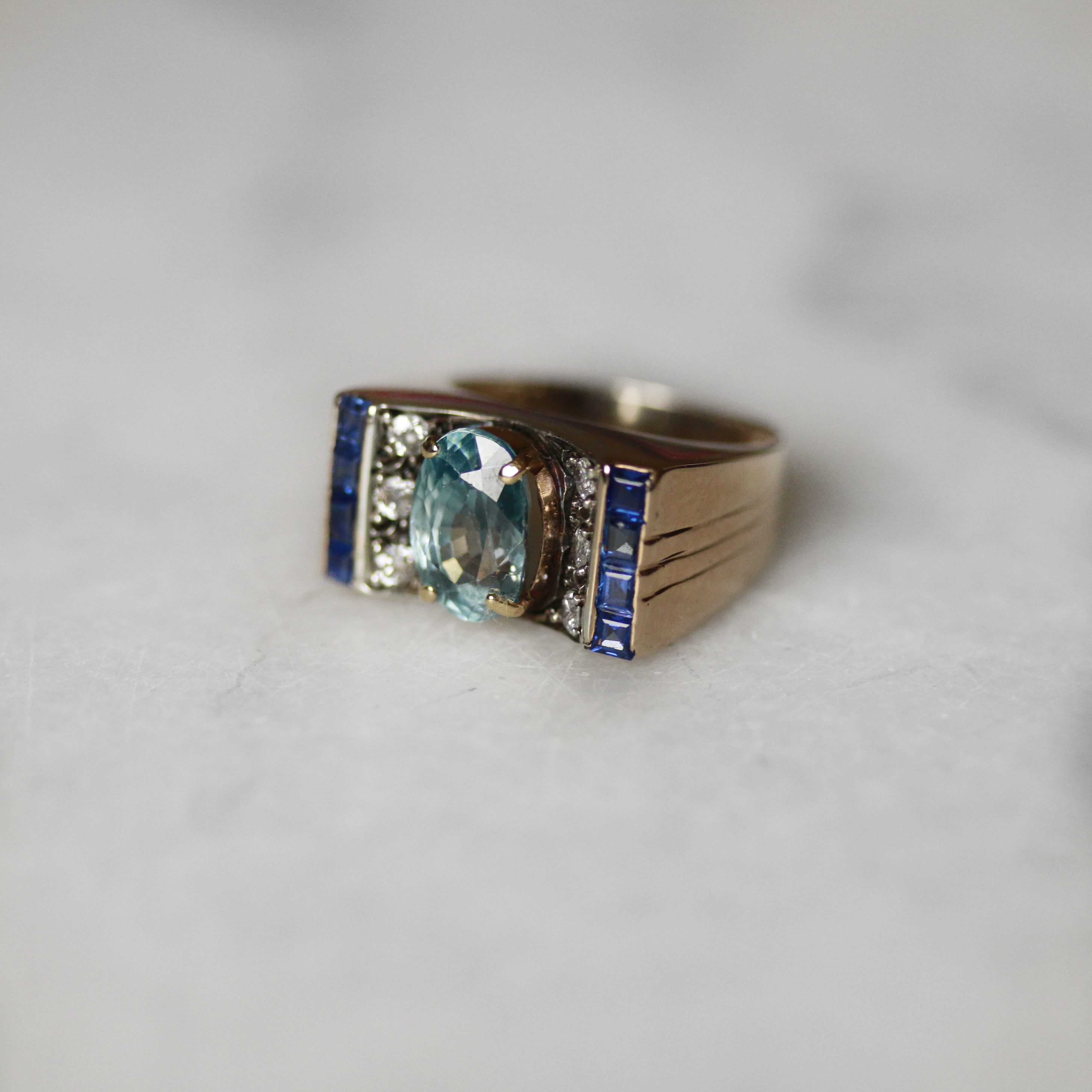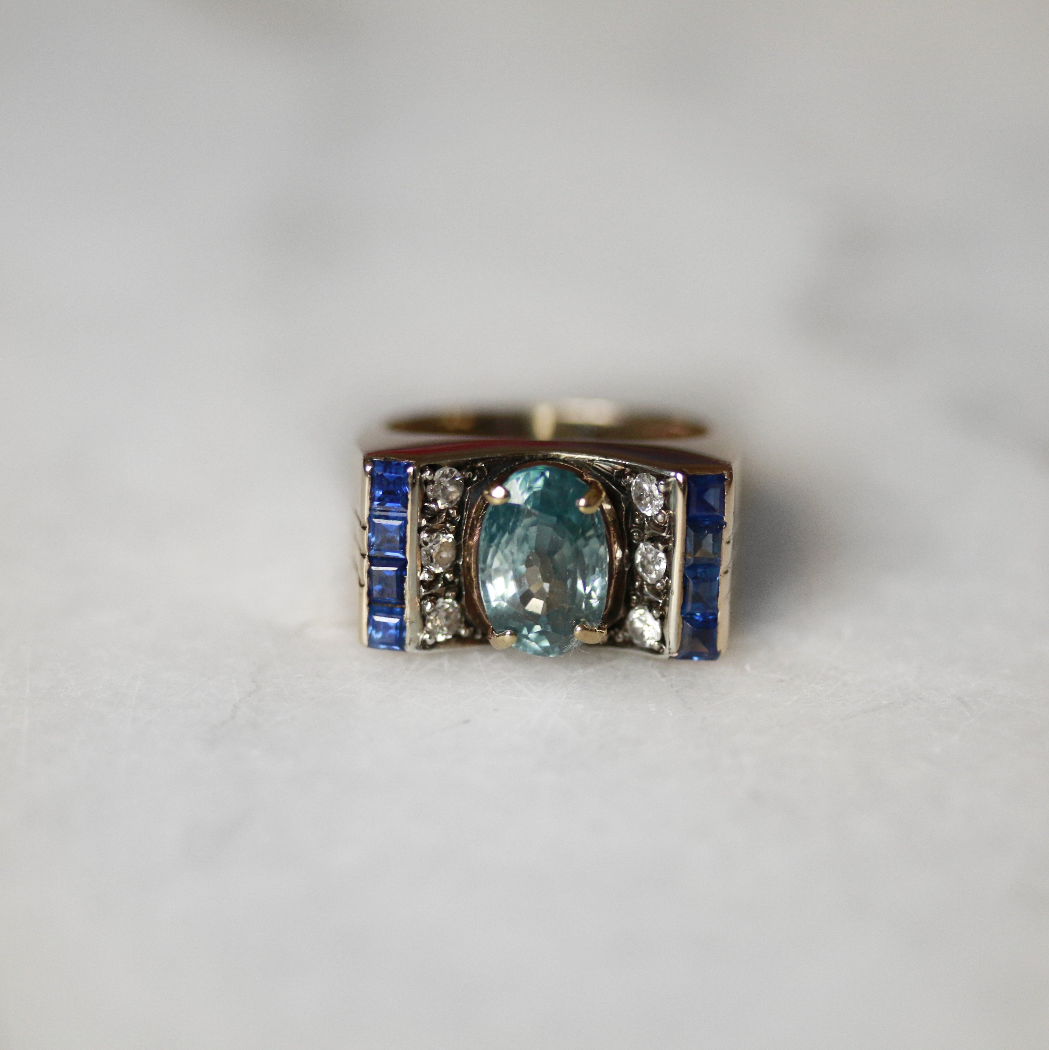 This vintage dress ring showcases a striking oval blue zircon centrepiece set in 9ct yellow gold, flanked by six round brilliant diamonds and geometric accents of square-cut sapphires. The raised, angular design reflects mid-century craftsmanship, circa 1950s. A sophisticated statement piece for special occasions.