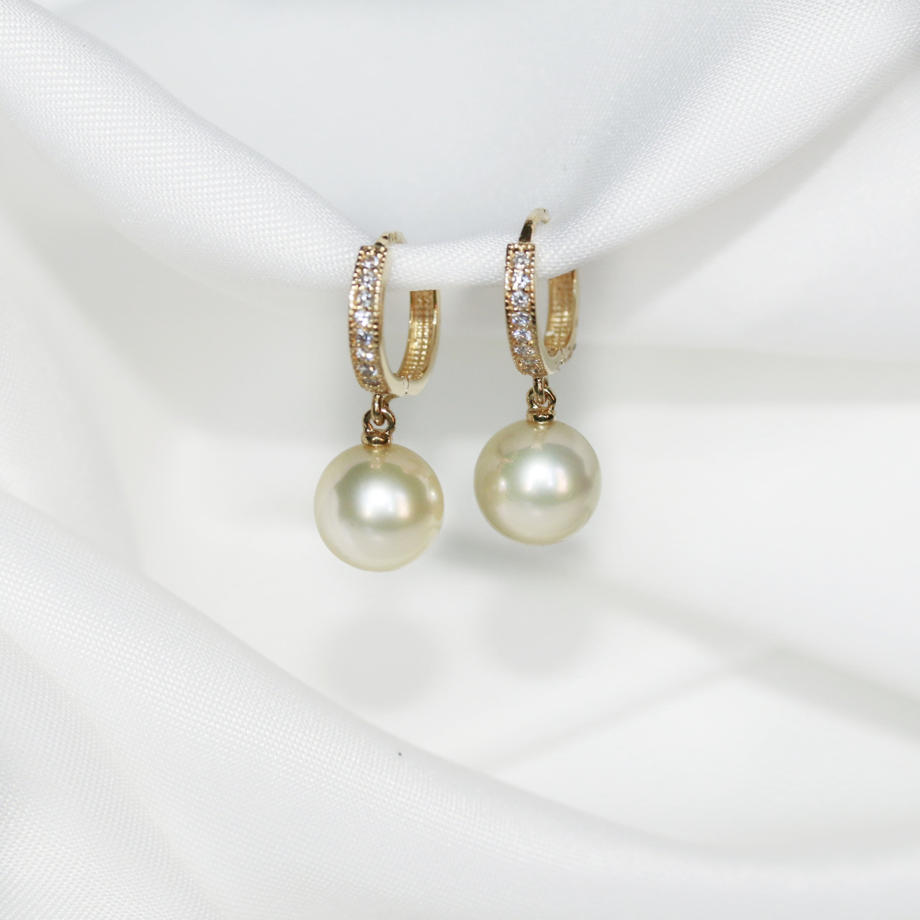 Elevate your jewellery collection with these exquisite 18ct yellow gold earrings, featuring lustrous champagne South Sea pearls suspended from elegant pavé-set hoops adorned with 0.12ct of sparkling diamonds. The warm glow of yellow gold perfectly complements the soft, sophisticated tone of the pearls, creating a timeless piece that transitions effortlessly from day to evening wear.