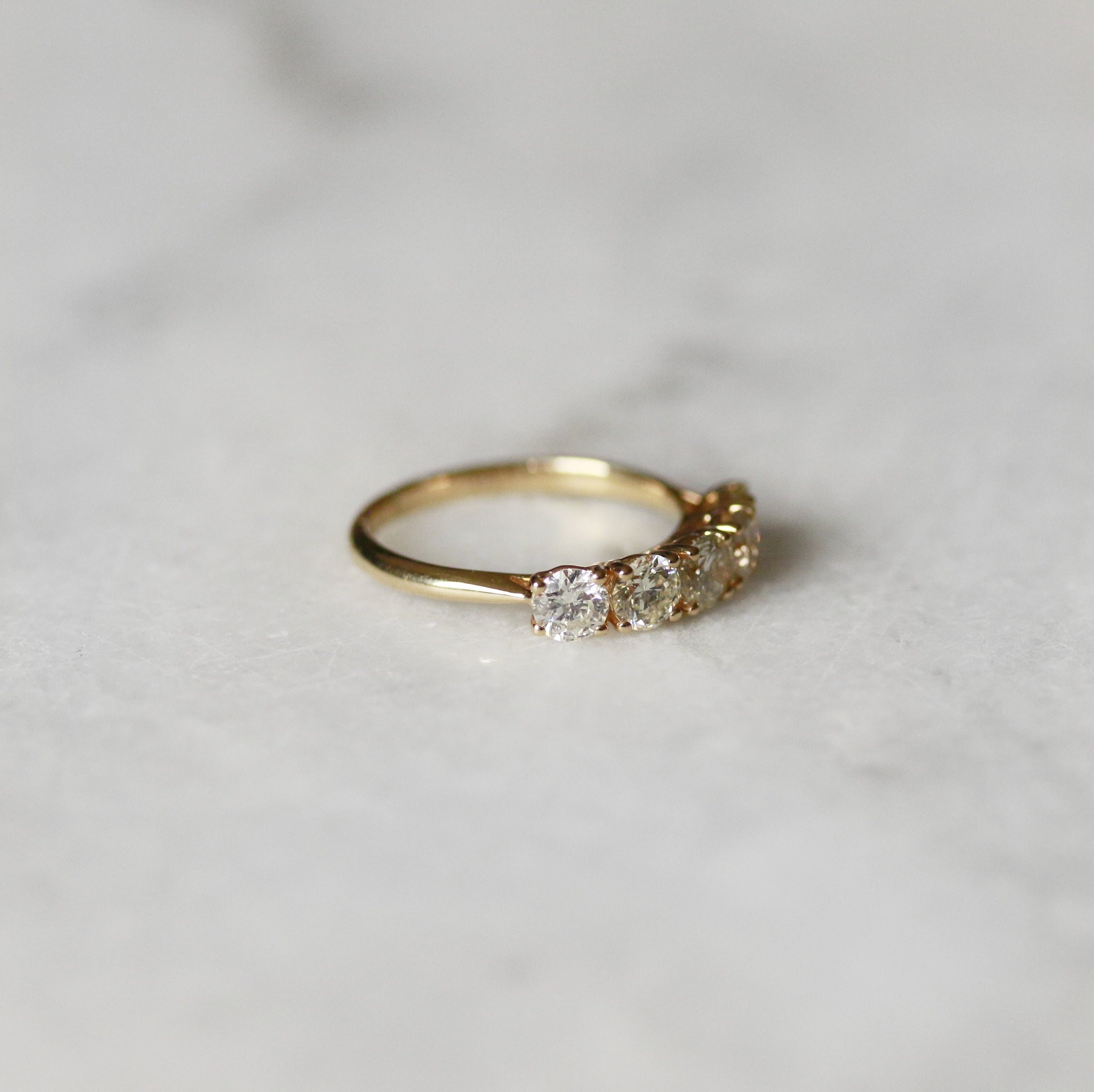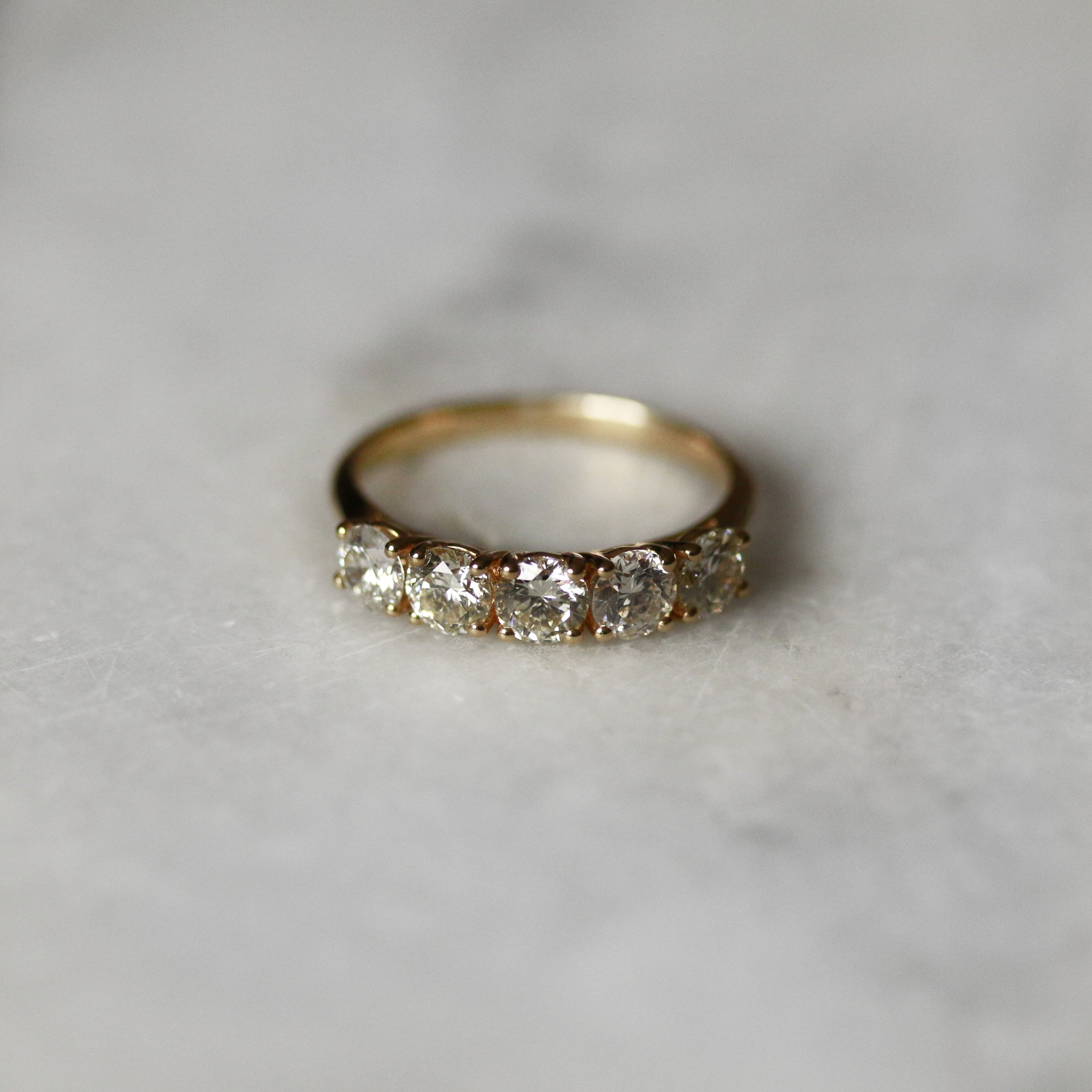 This elegant five-stone design showcases round brilliant cut diamonds totalling 1.37cts, each secured in refined claw settings and crafted from 18ct yellow gold. A timeless choice for those seeking understated sophistication and enduring sparkle.