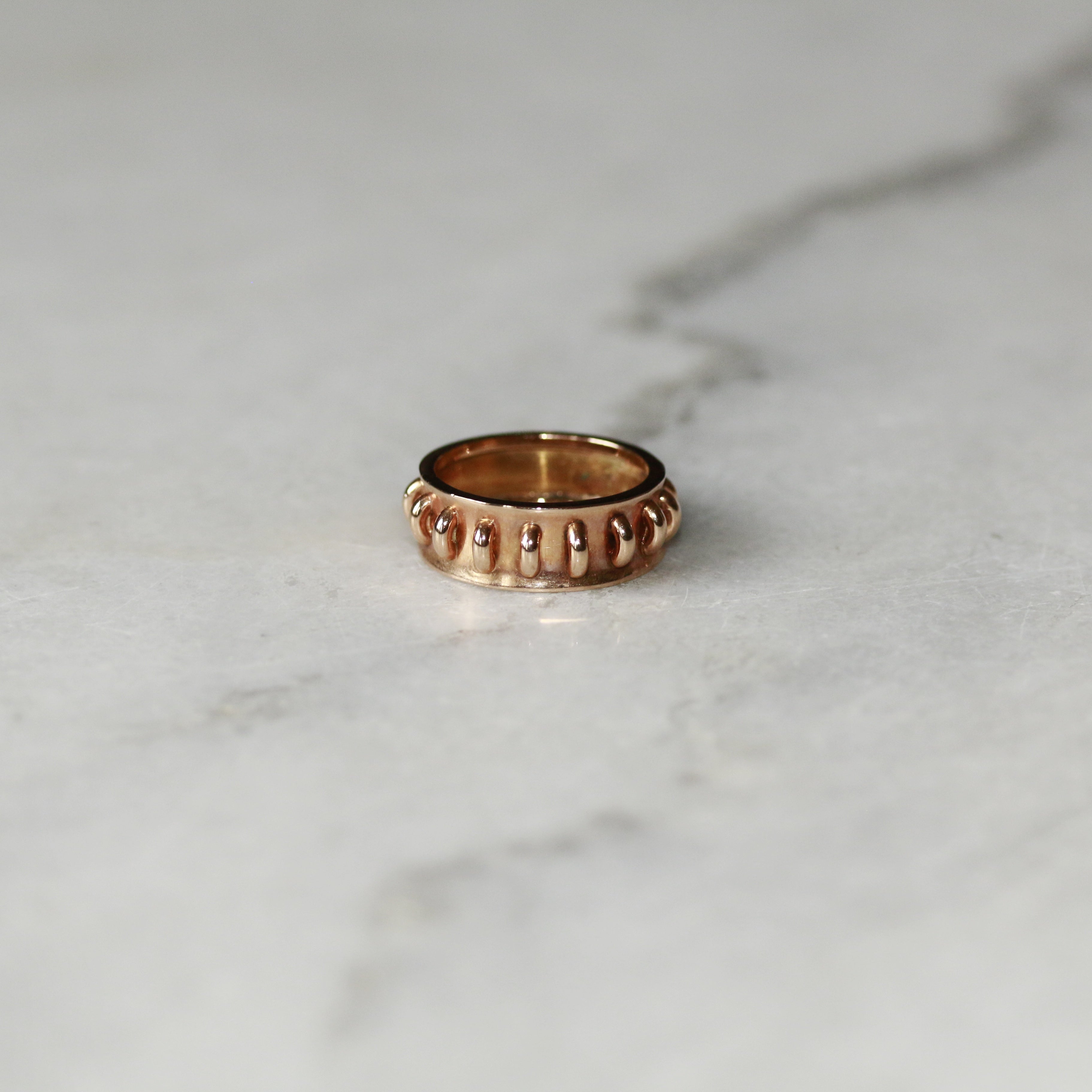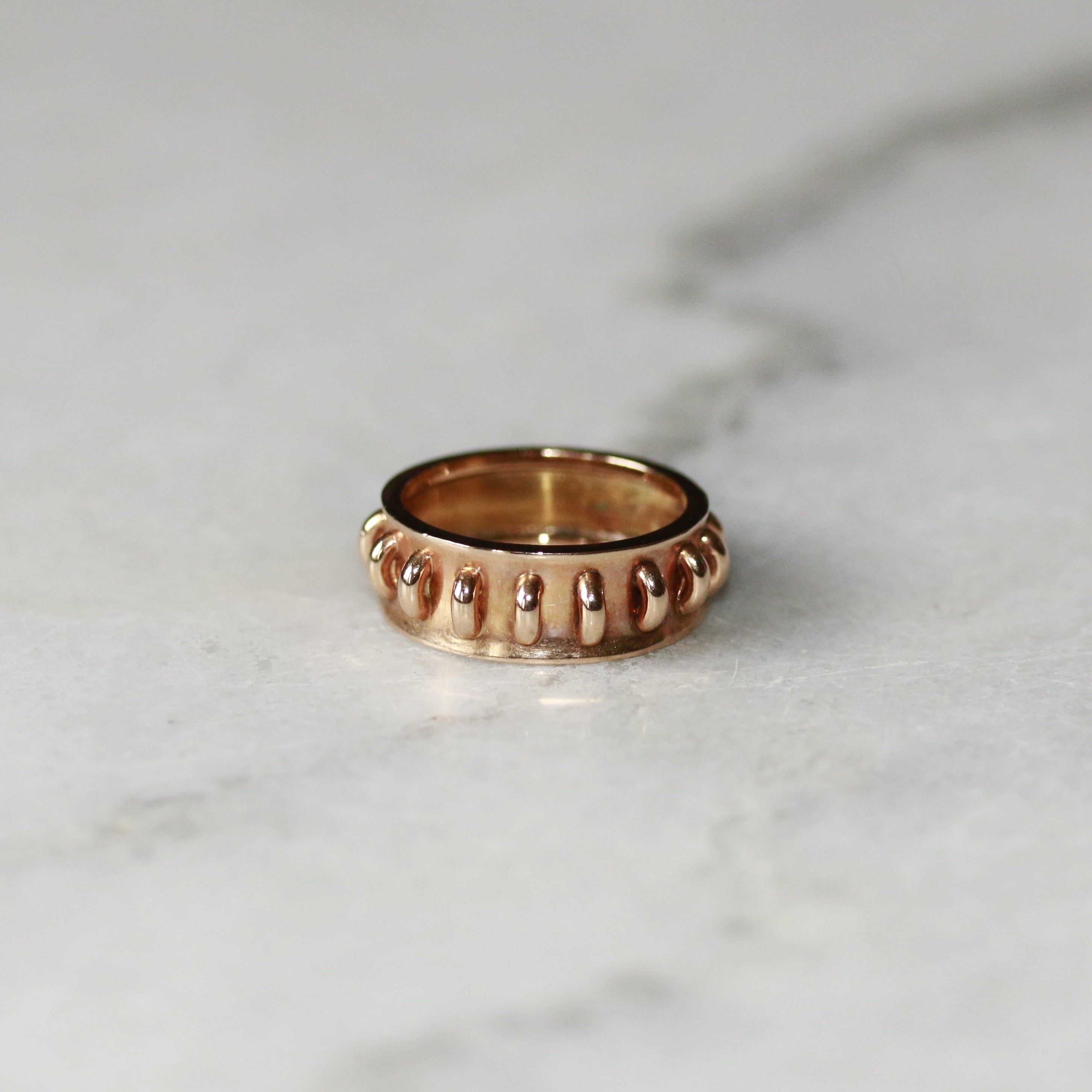 An 18ct rose gold ring, an unusual handmade design, concave profile with half rings set around the entire ring.