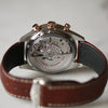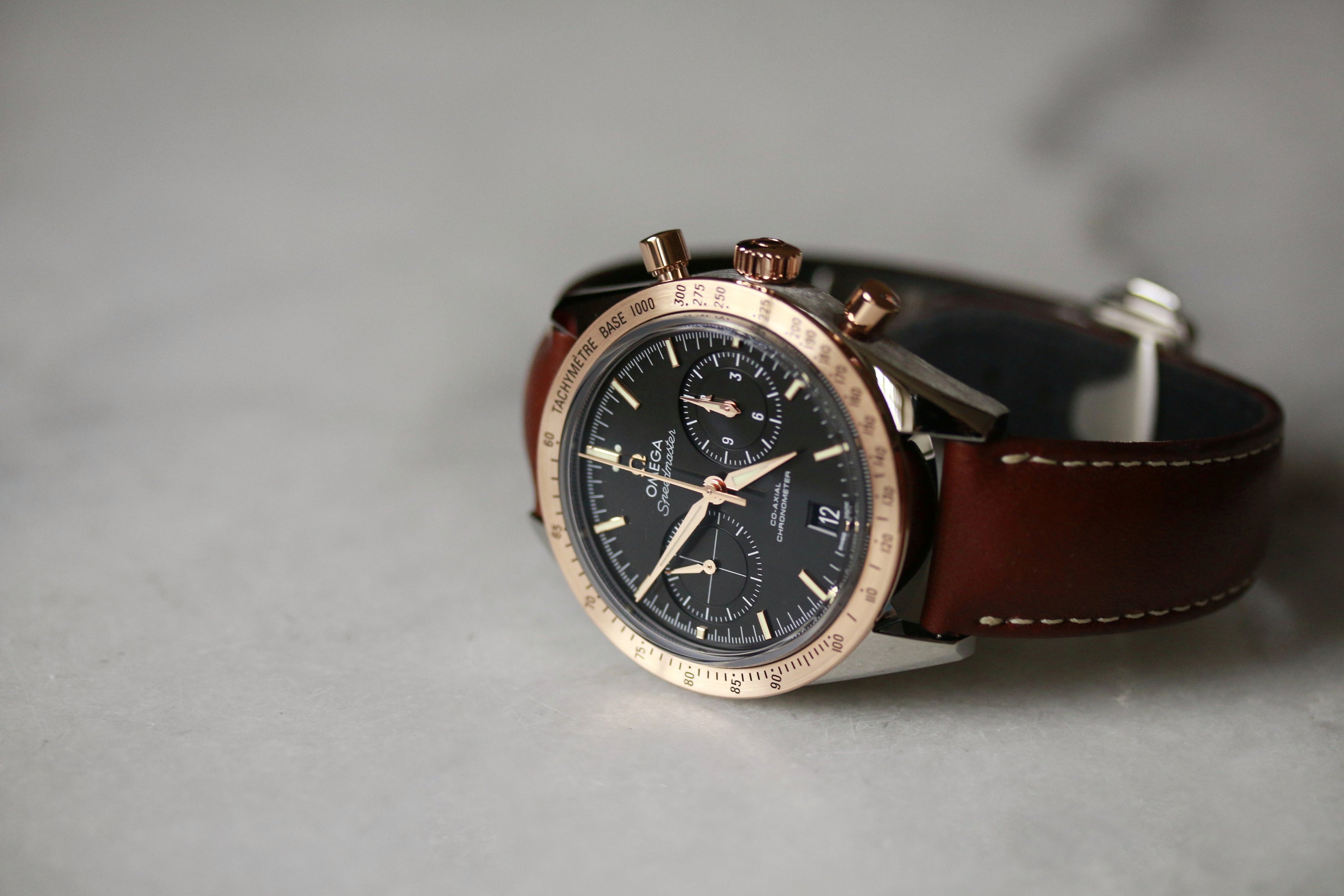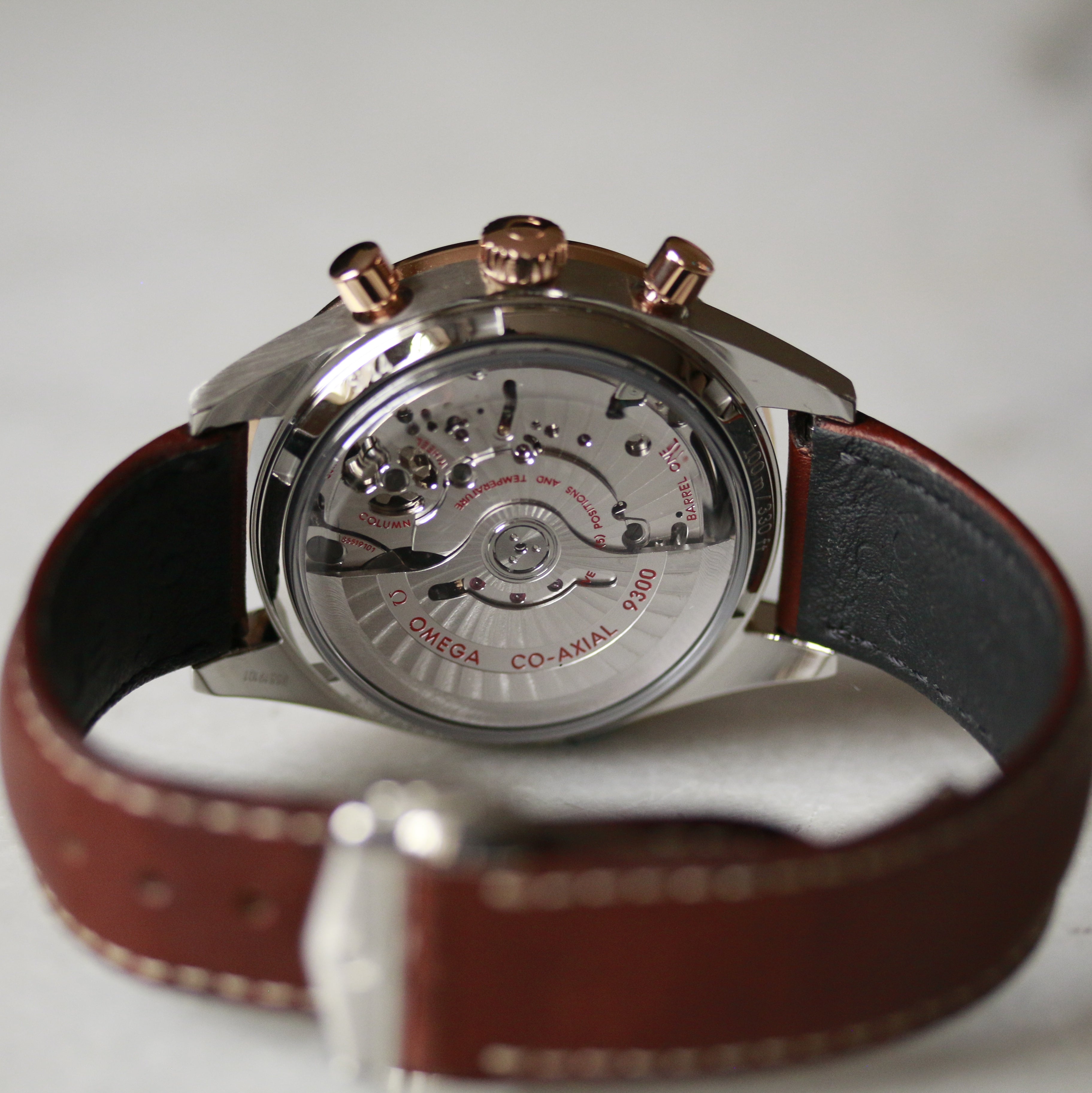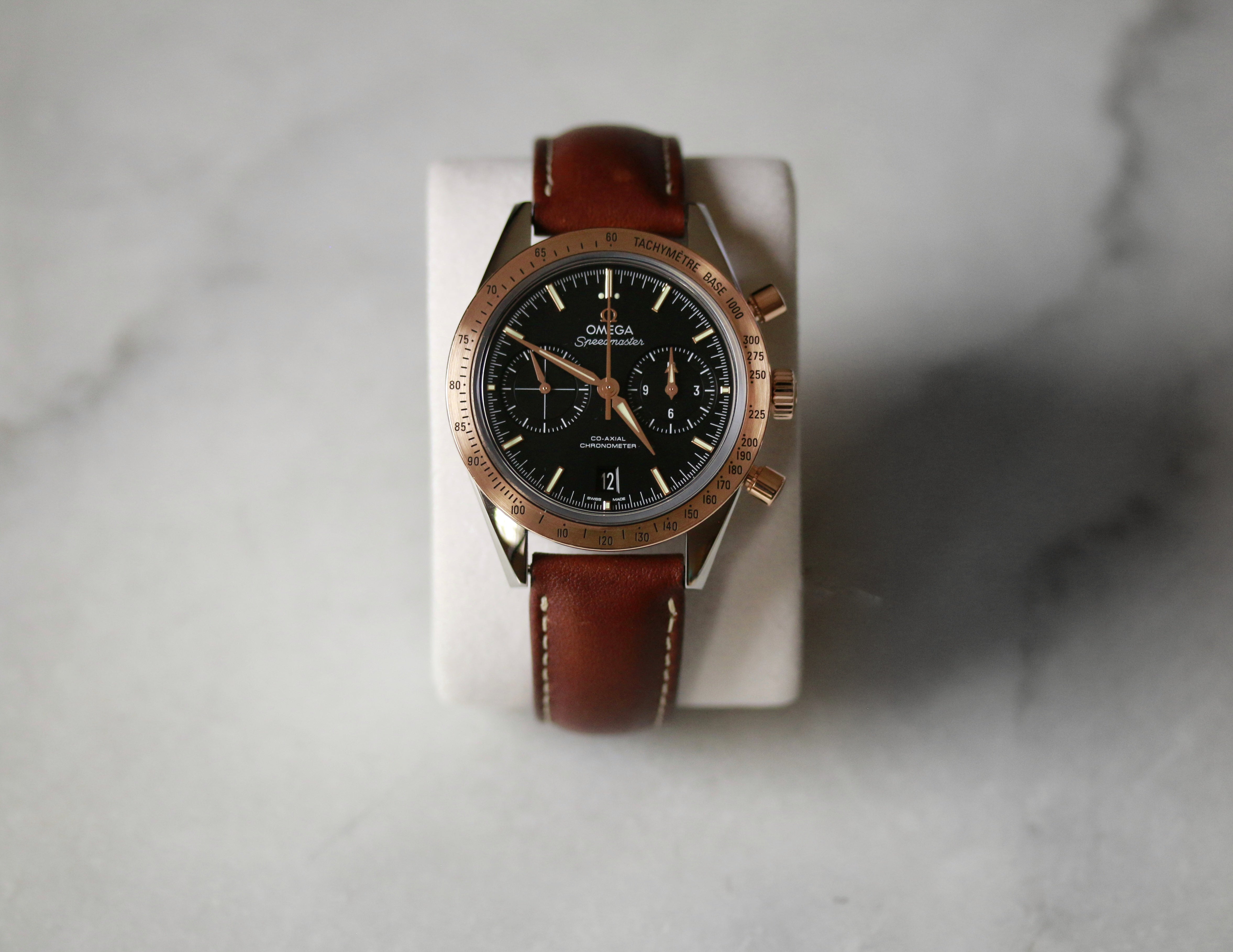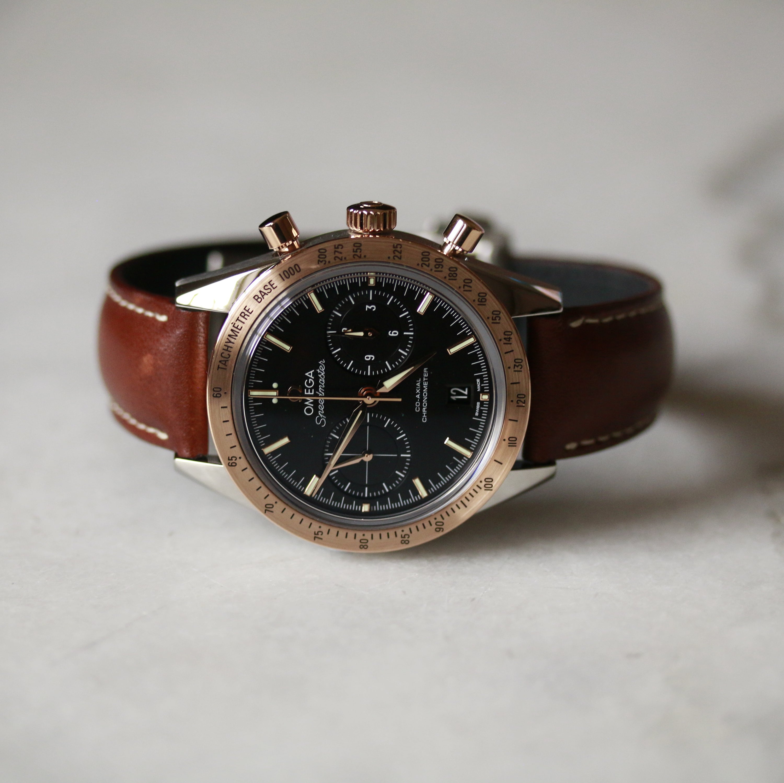 Iconic Omega Speedmaster timepiece featuring a refined two-tone construction in stainless steel and rose gold. Powered by automatic movement, this chronograph exemplifies Swiss watchmaking precision. Presented on a supple brown leather bracelet, it combines durability with understated elegance. Recently serviced by Omega to factory specifications, ensuring optimal performance and longevity.