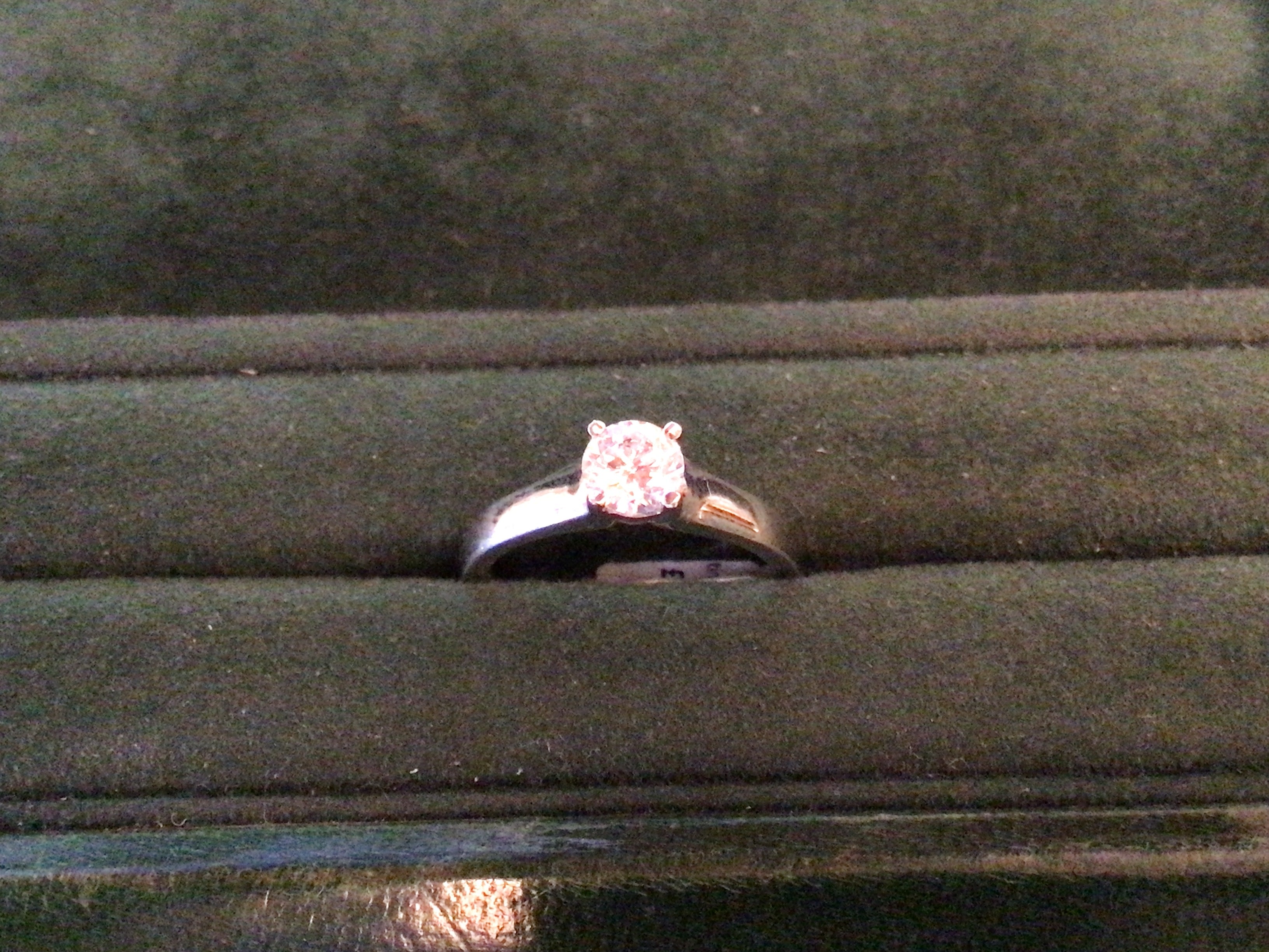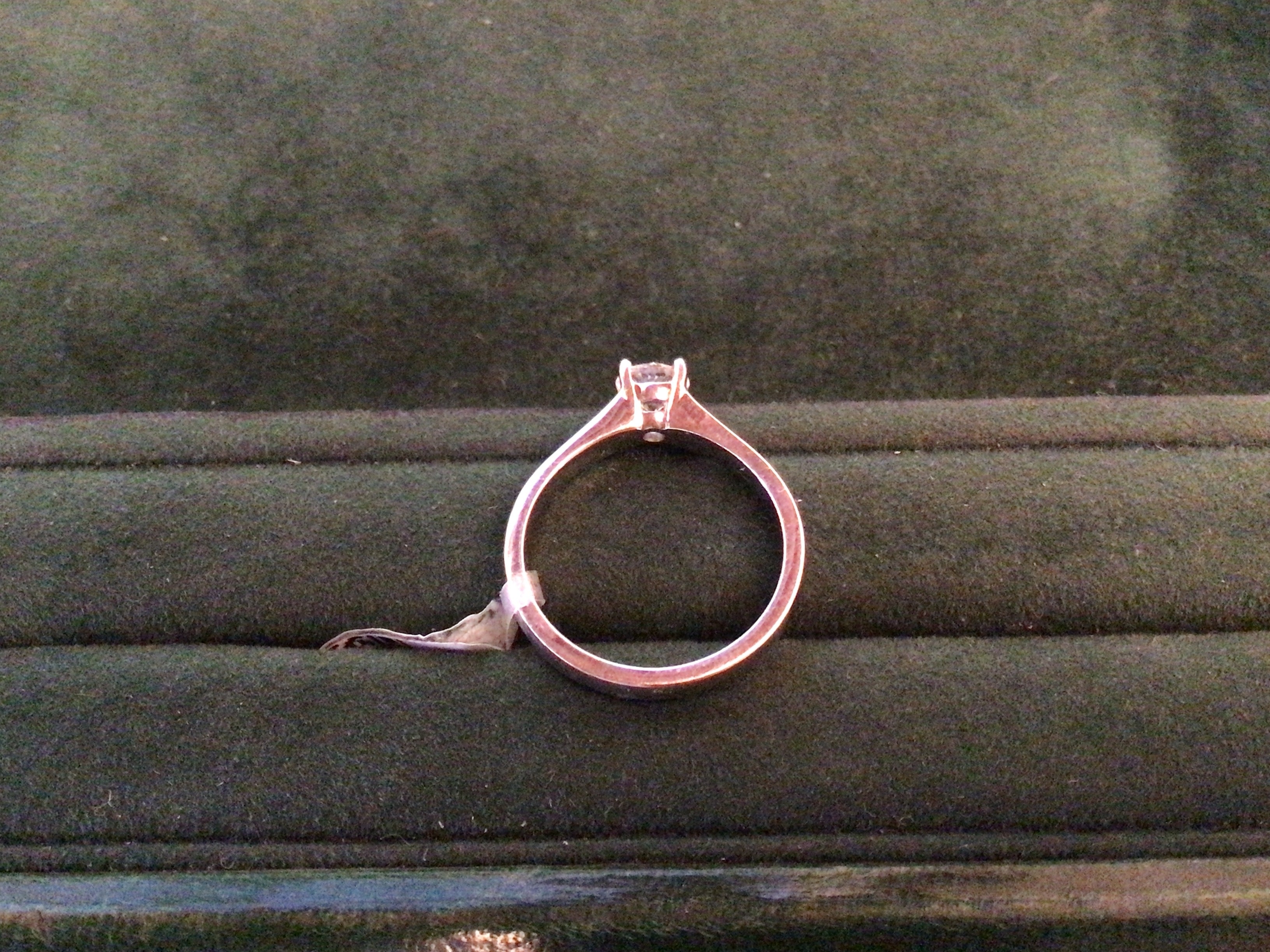 A platinum round brilliant cut Diamond solitaire ring with a thick band.