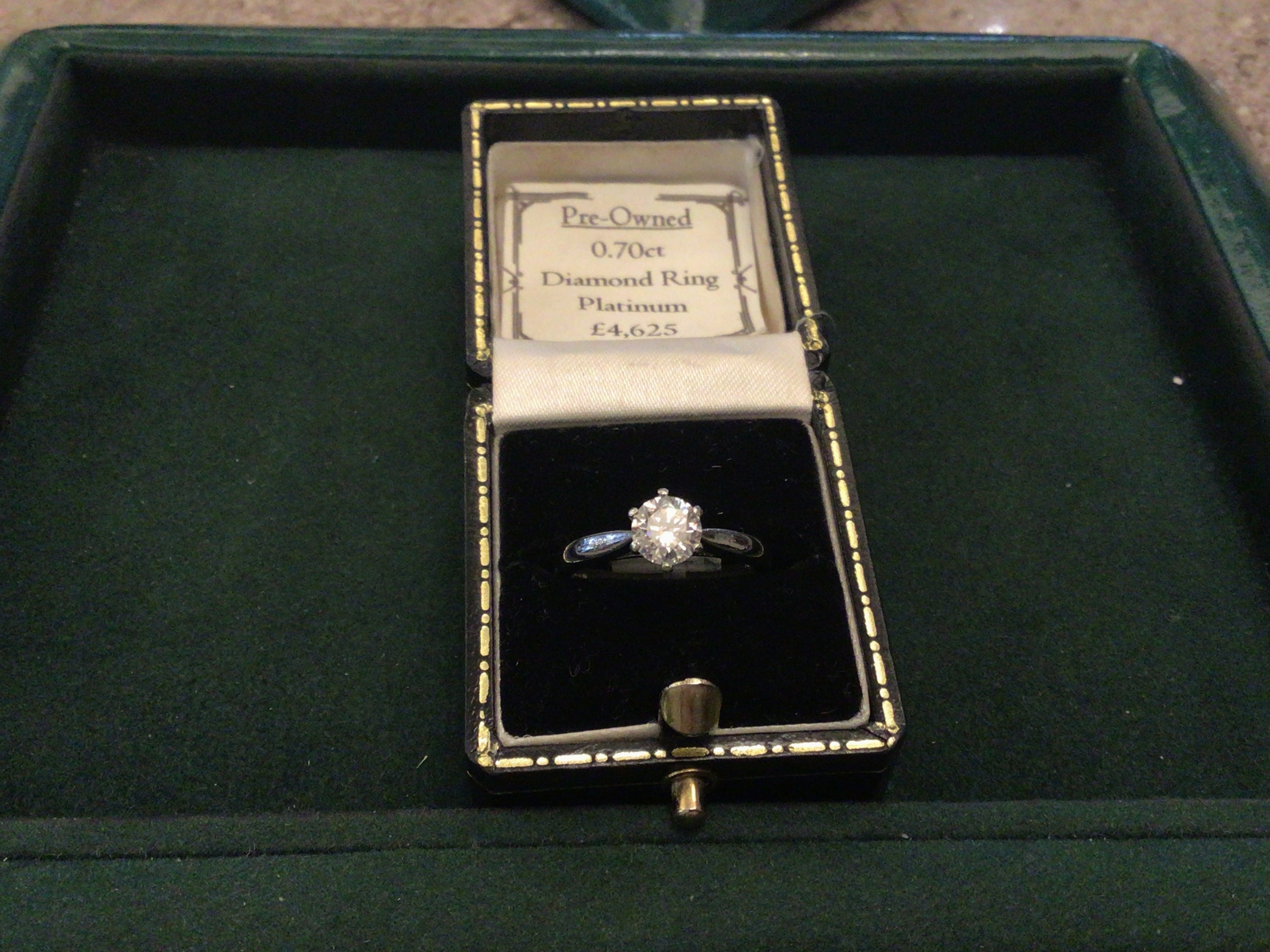 A platinum diamond solitaire ring featuring a 0.70ct round brilliant diamond in a six claw setting.