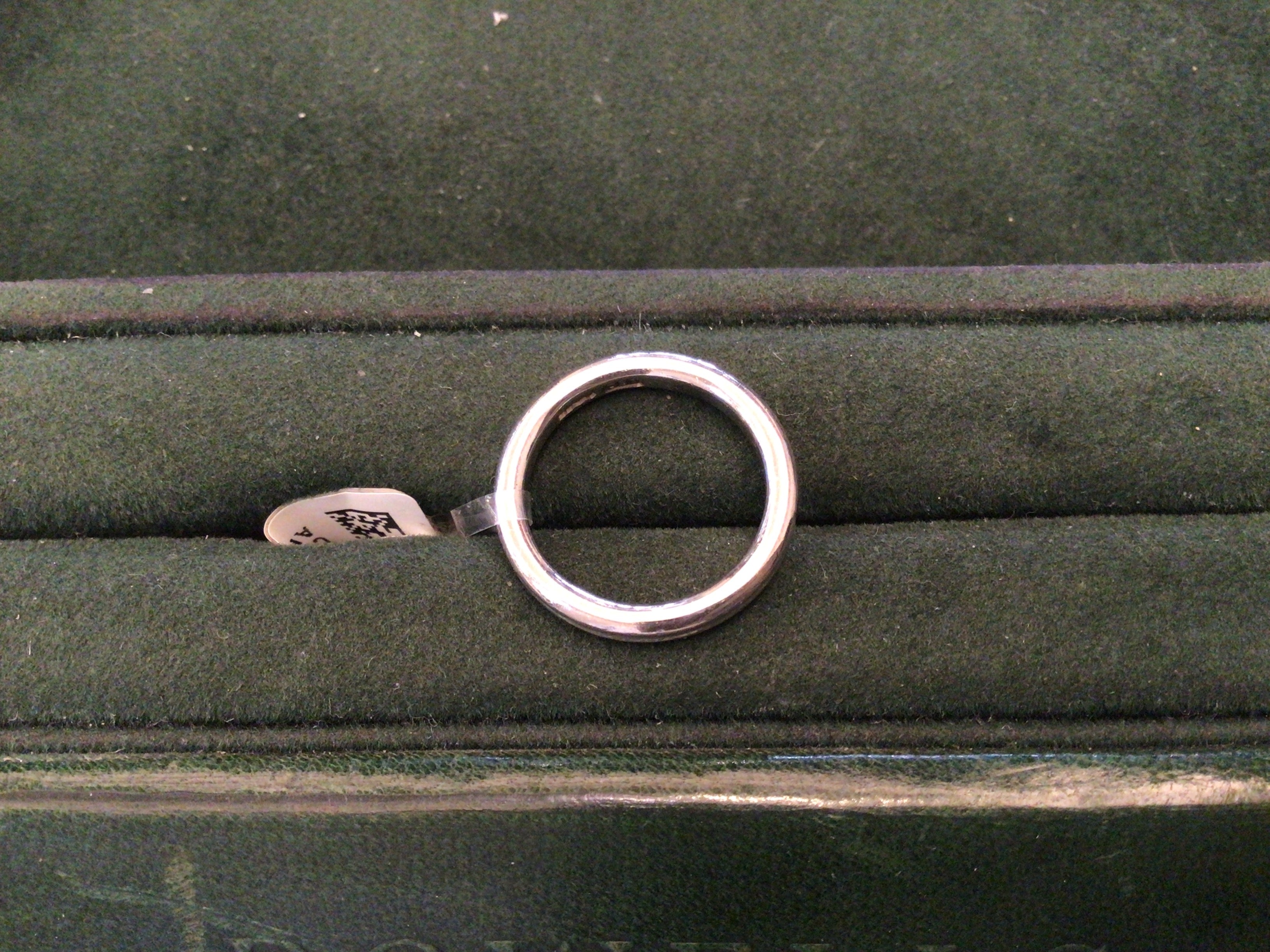 A platinum wedding band of 2mm in width with fine line detailing. Weight approximately 3.6g