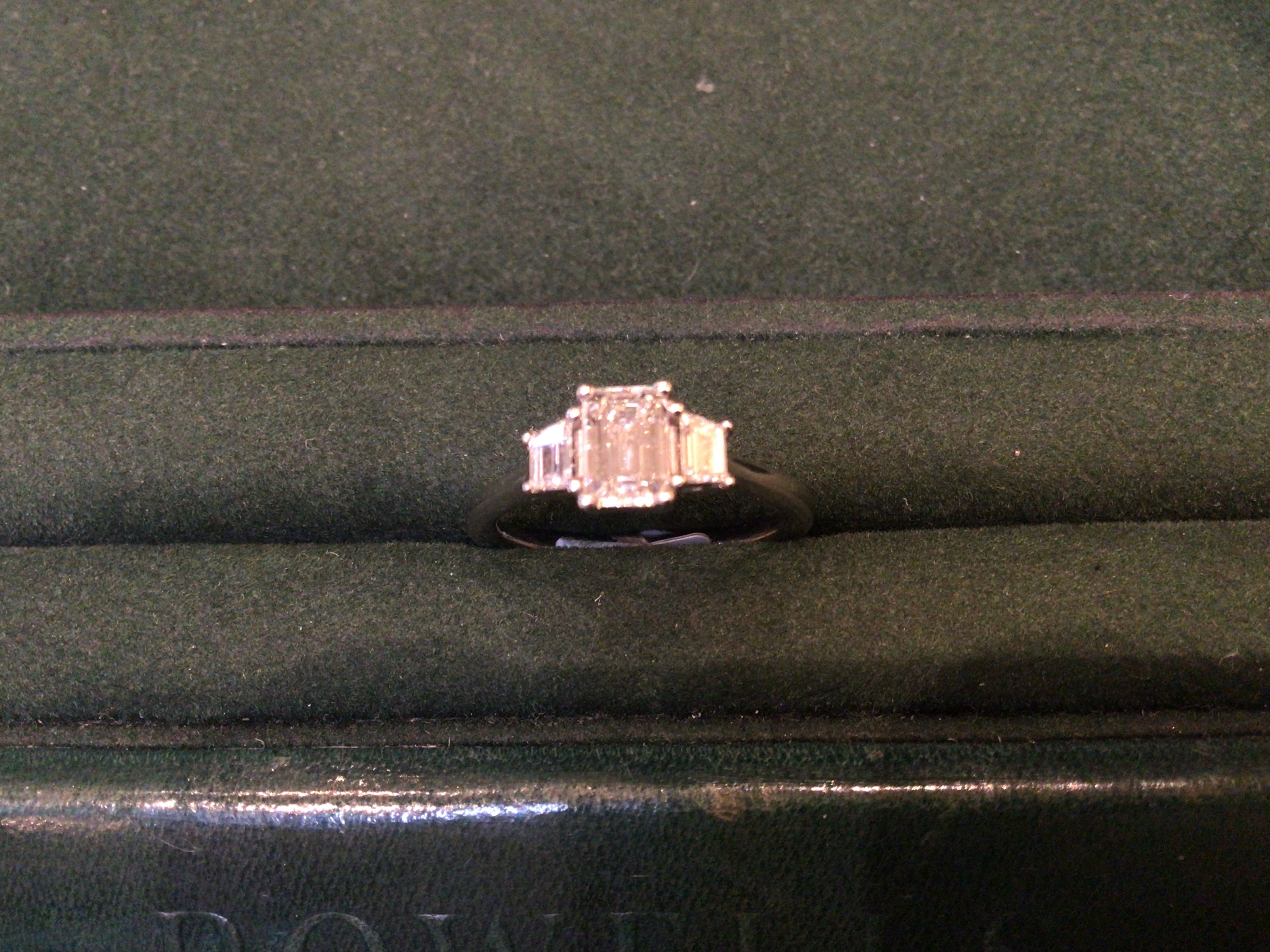 A platinum three stone emerald cut Diamond ring with four claw setting.