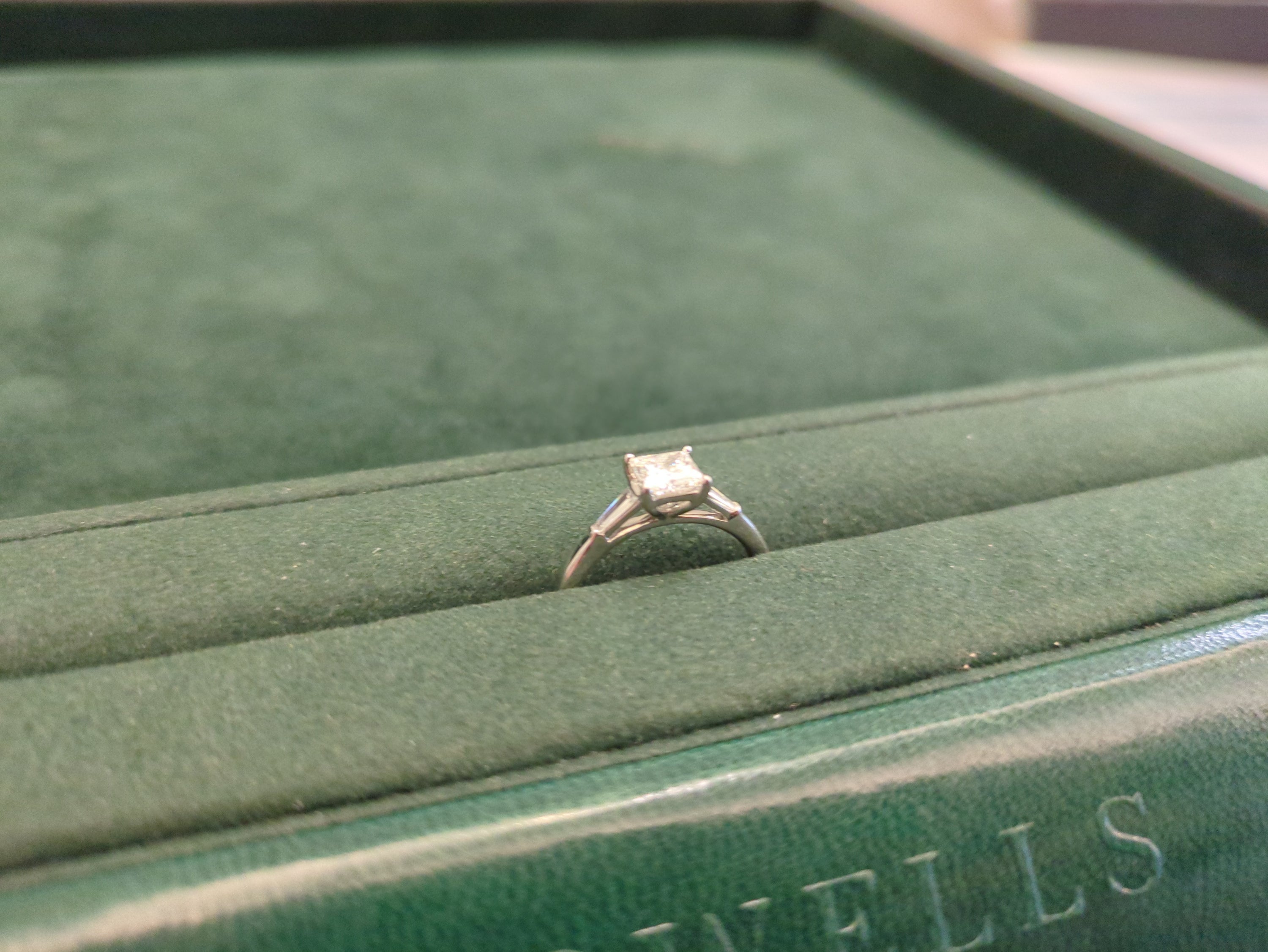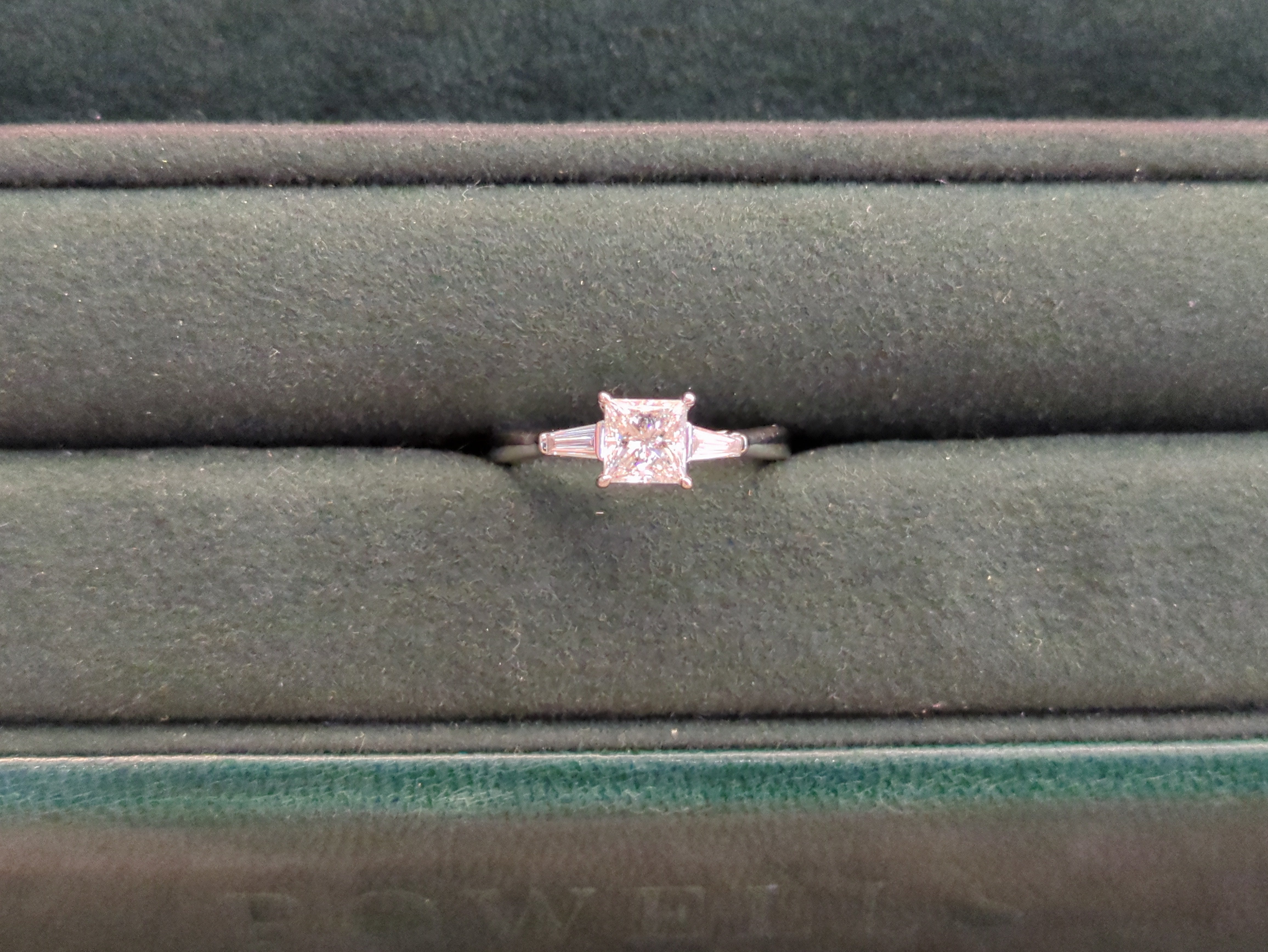 0.70ct princess cut diamond set with a total weight of approximately 0.18ct baguette cut diamonds on the shoulders.