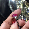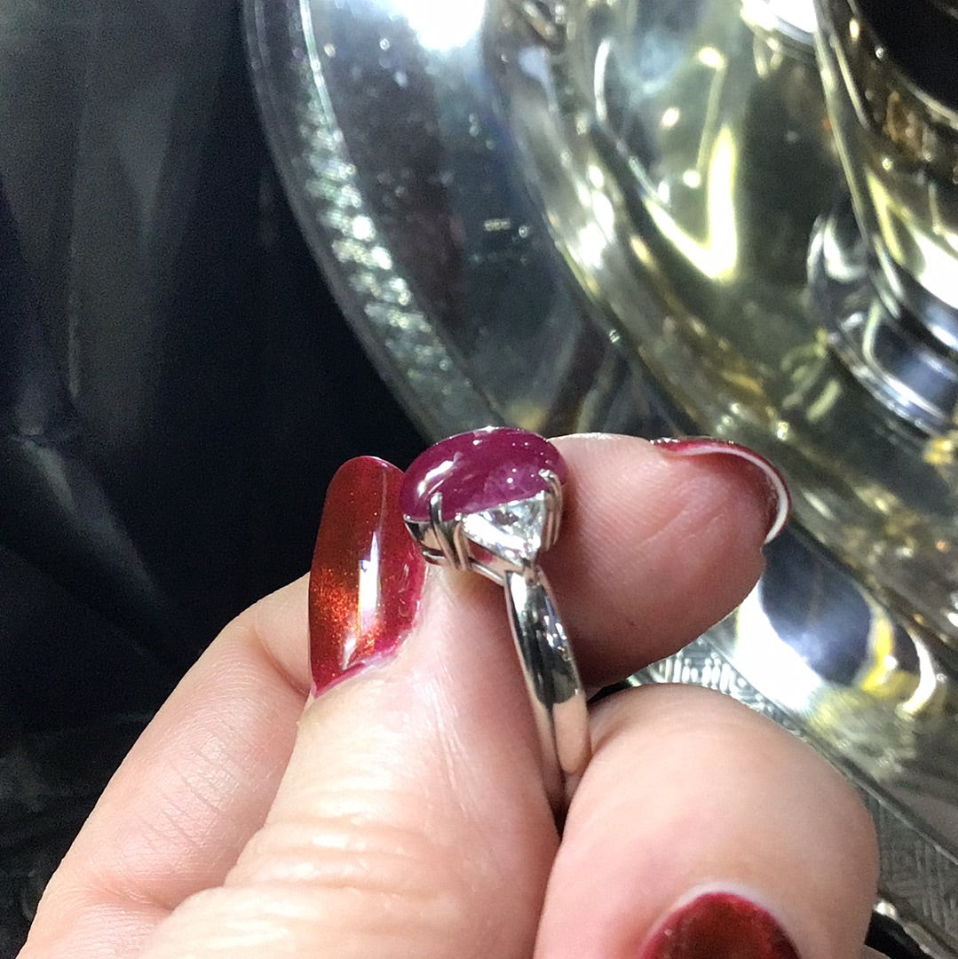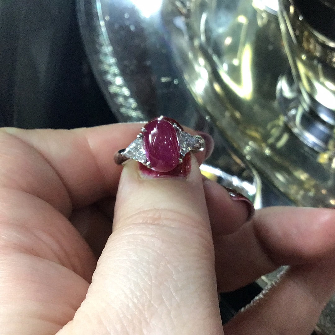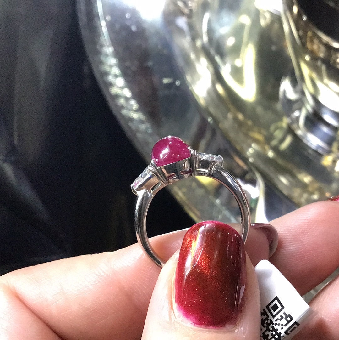 A platinum star ruby and diamond three stone ring featuring a central cabochon cut star ruby set between two trilliant cut diamonds.