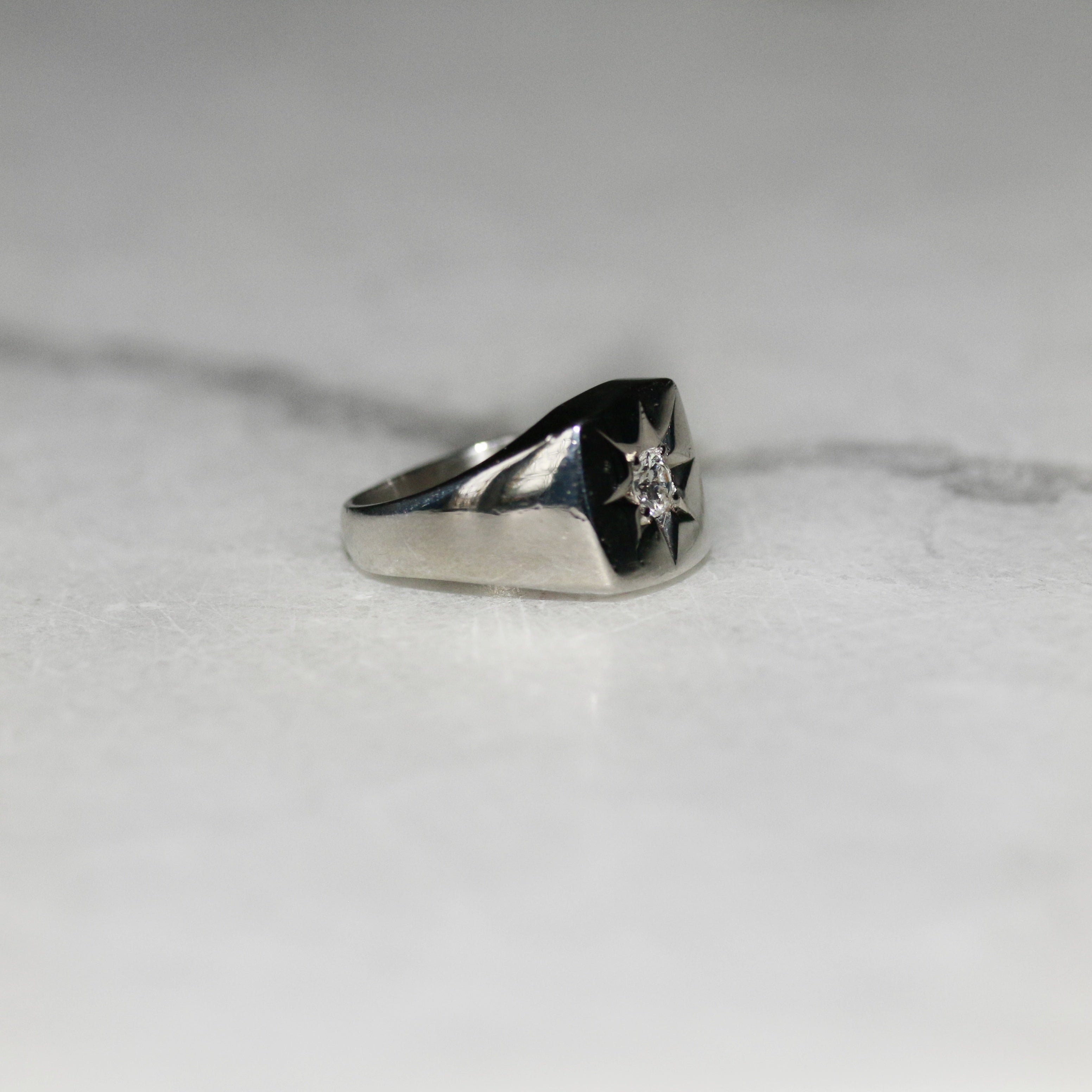 This elegant signet ring combines timeless design with refined craftsmanship, featuring a 0.25ct round brilliant diamond secured in a distinctive star setting. Crafted from platinum for lasting durability and lustre, the cushion-shaped band offers a sophisticated silhouette. The brilliant cut maximises light return, ensuring your diamond catches and reflects brilliance with every movement.
