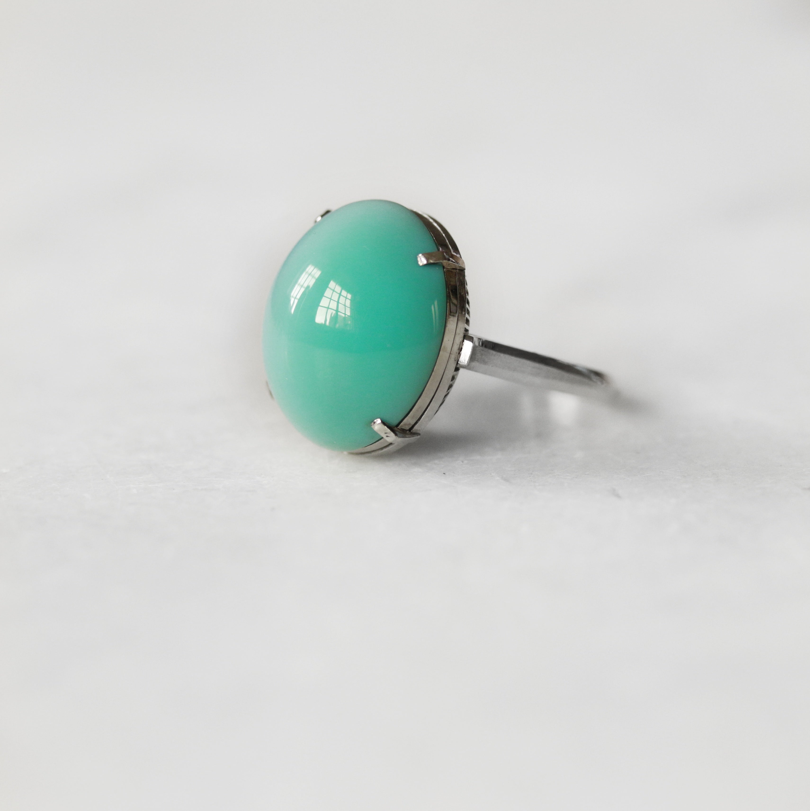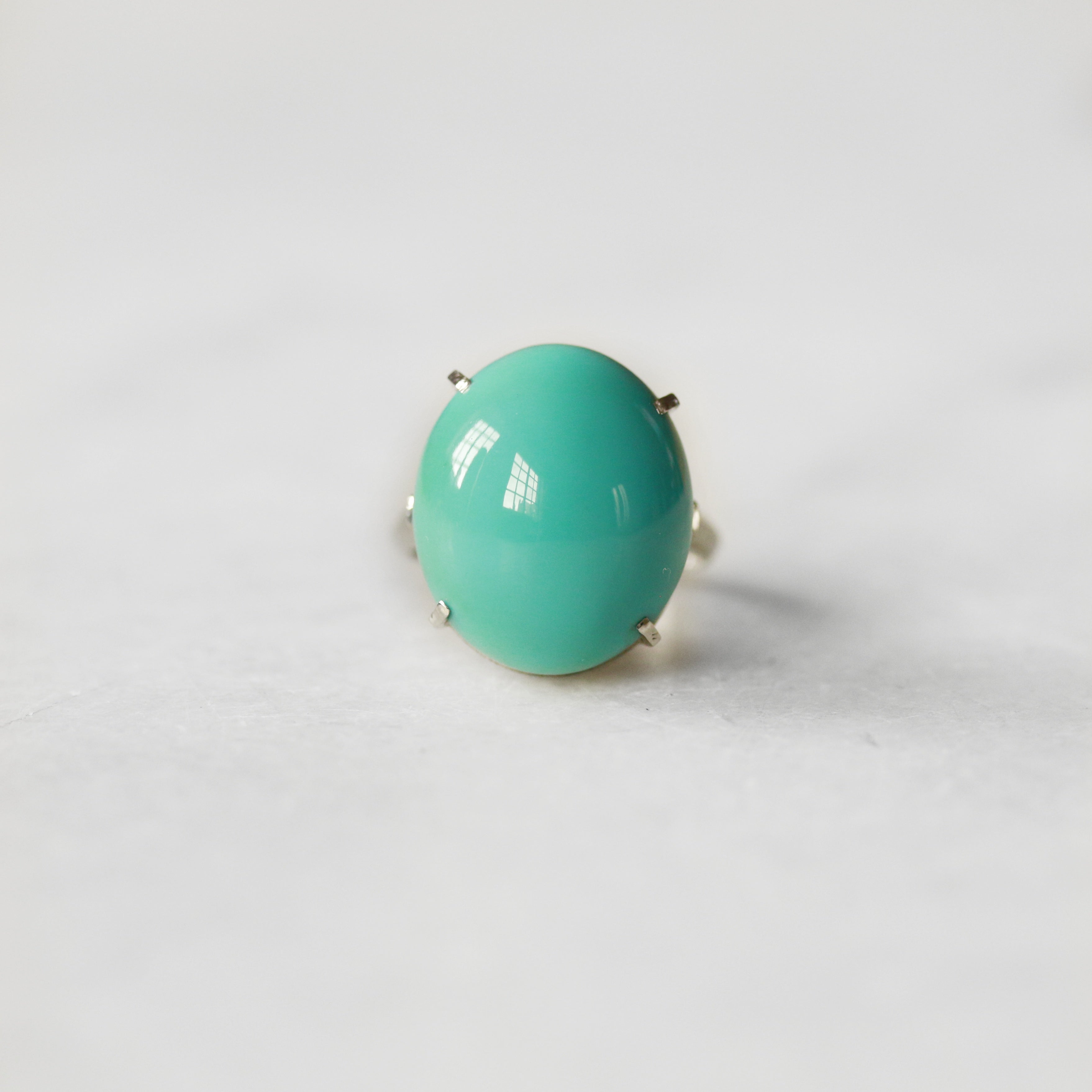A stunning dress ring showcasing a magnificent 13.61-carat cabochon turquoise stone set in luxurious platinum. The smooth, polished turquoise displays rich colour and natural character, while the platinum setting provides timeless elegance and durability. Perfect for adding a touch of sophisticated colour to any occasion, this piece combines classic design with the distinctive beauty of fine turquoise.