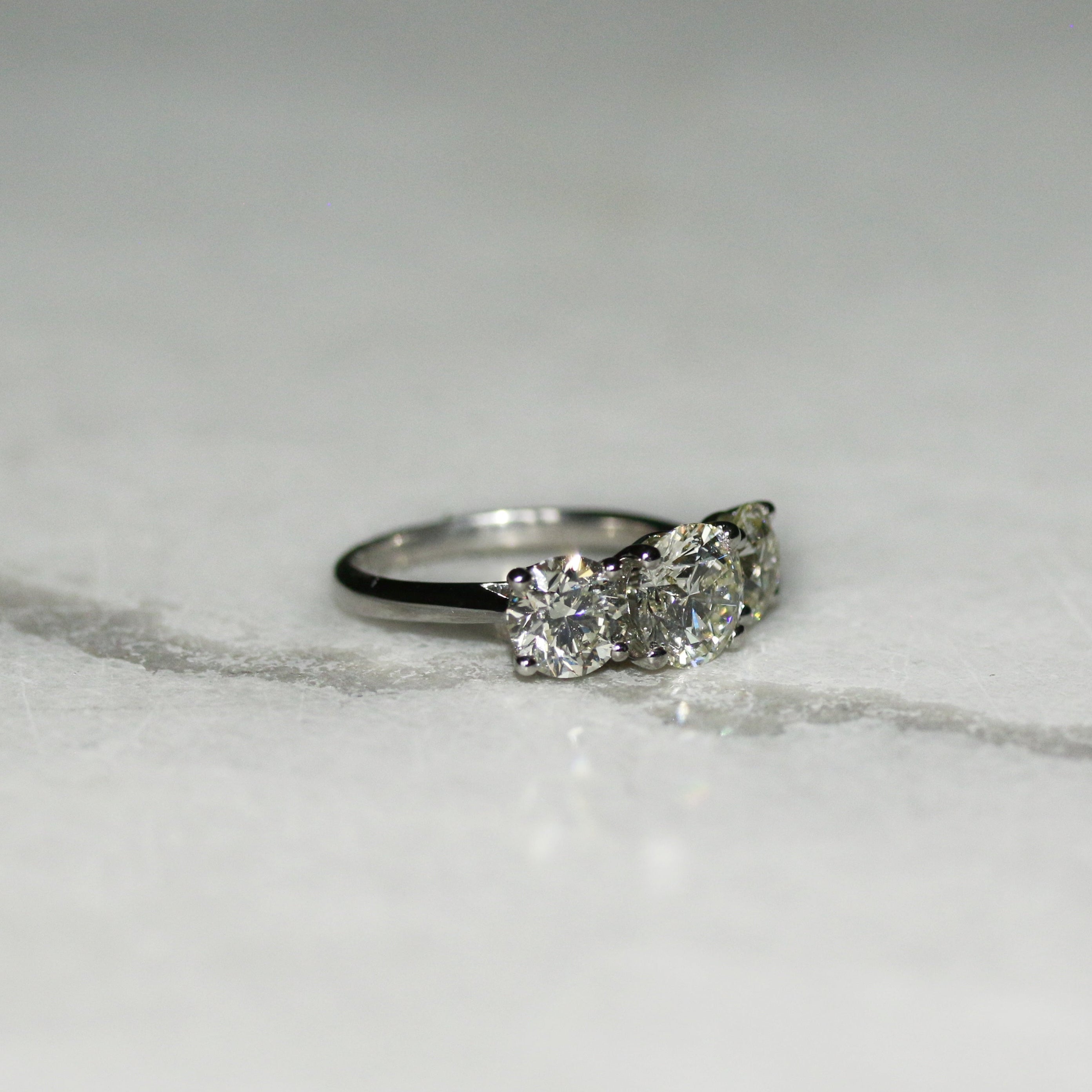 This elegant platinum ring showcases three graduated round brilliant diamonds in secure claw settings, with a combined weight of 4.44 carats. The classic three stone design balances timeless sophistication with contemporary craftsmanship, making it an ideal choice for engagements or significant milestones.