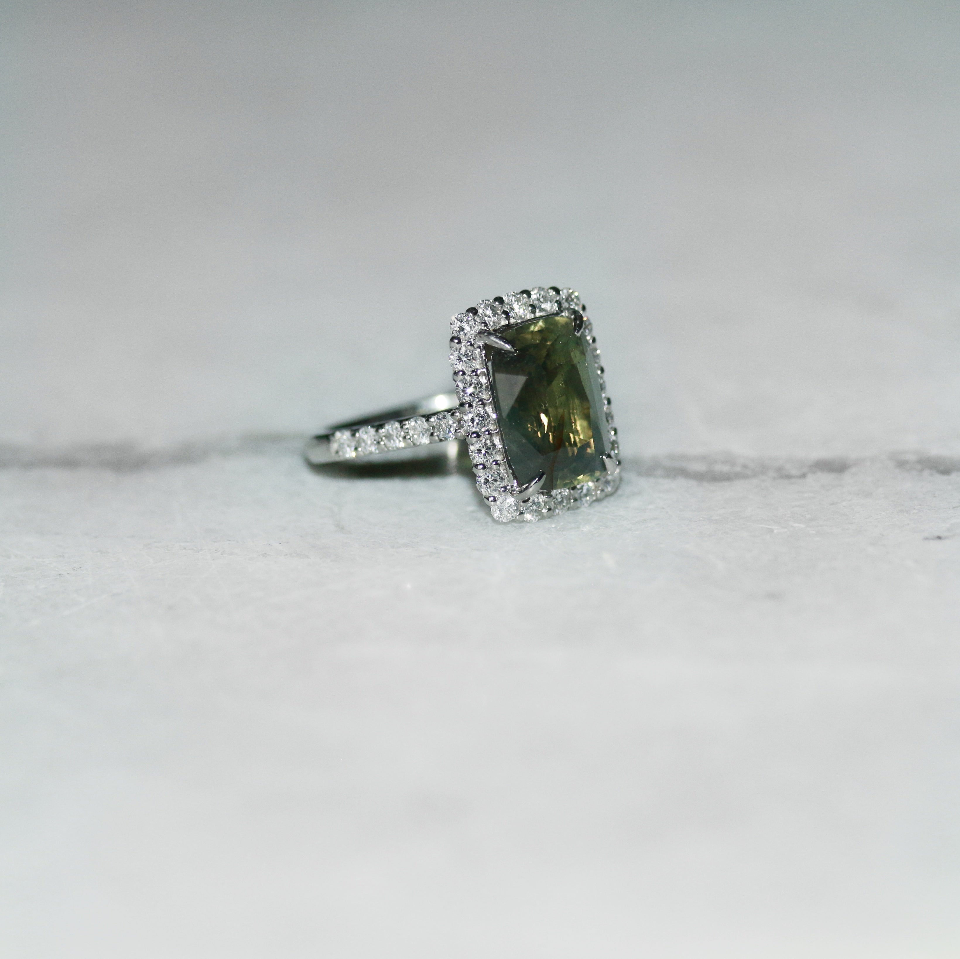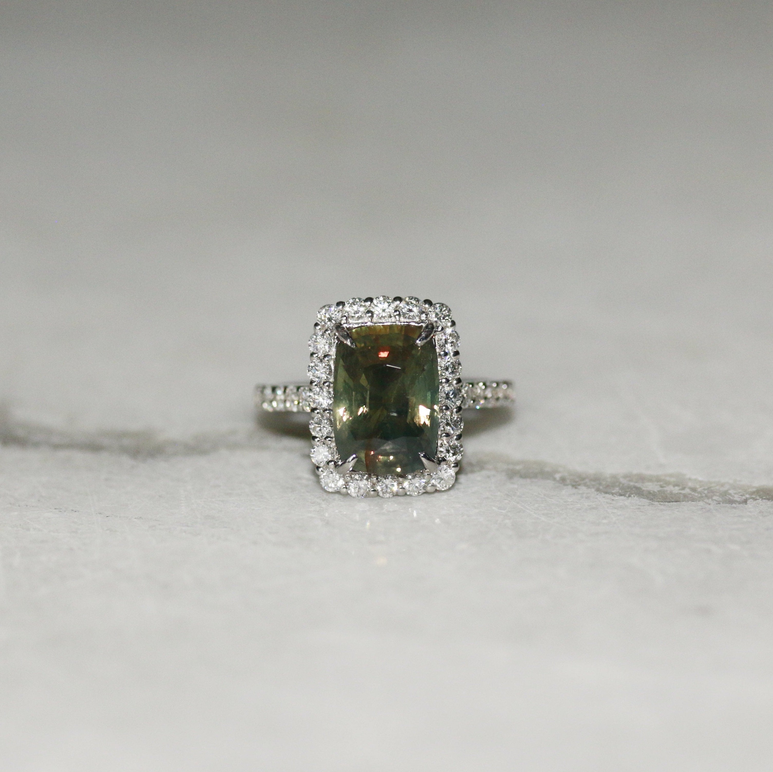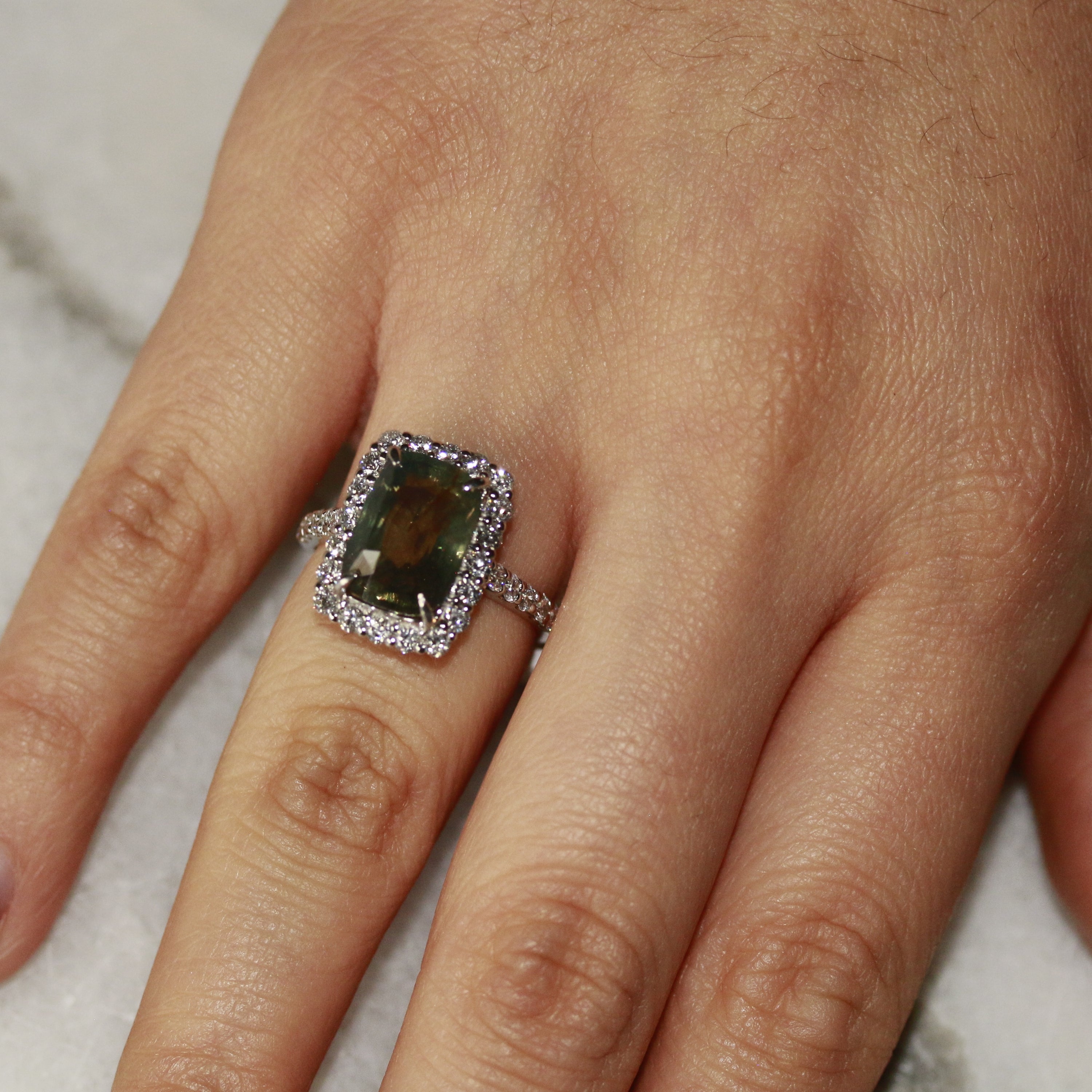 This platinum cluster ring features a magnificent 4.98ct alexandrite from Sri Lanka, renowned for its colour-shifting properties, surrounded by 0.95ct of diamonds in a classic halo setting. Diamond-set shoulders enhance the design's elegance.