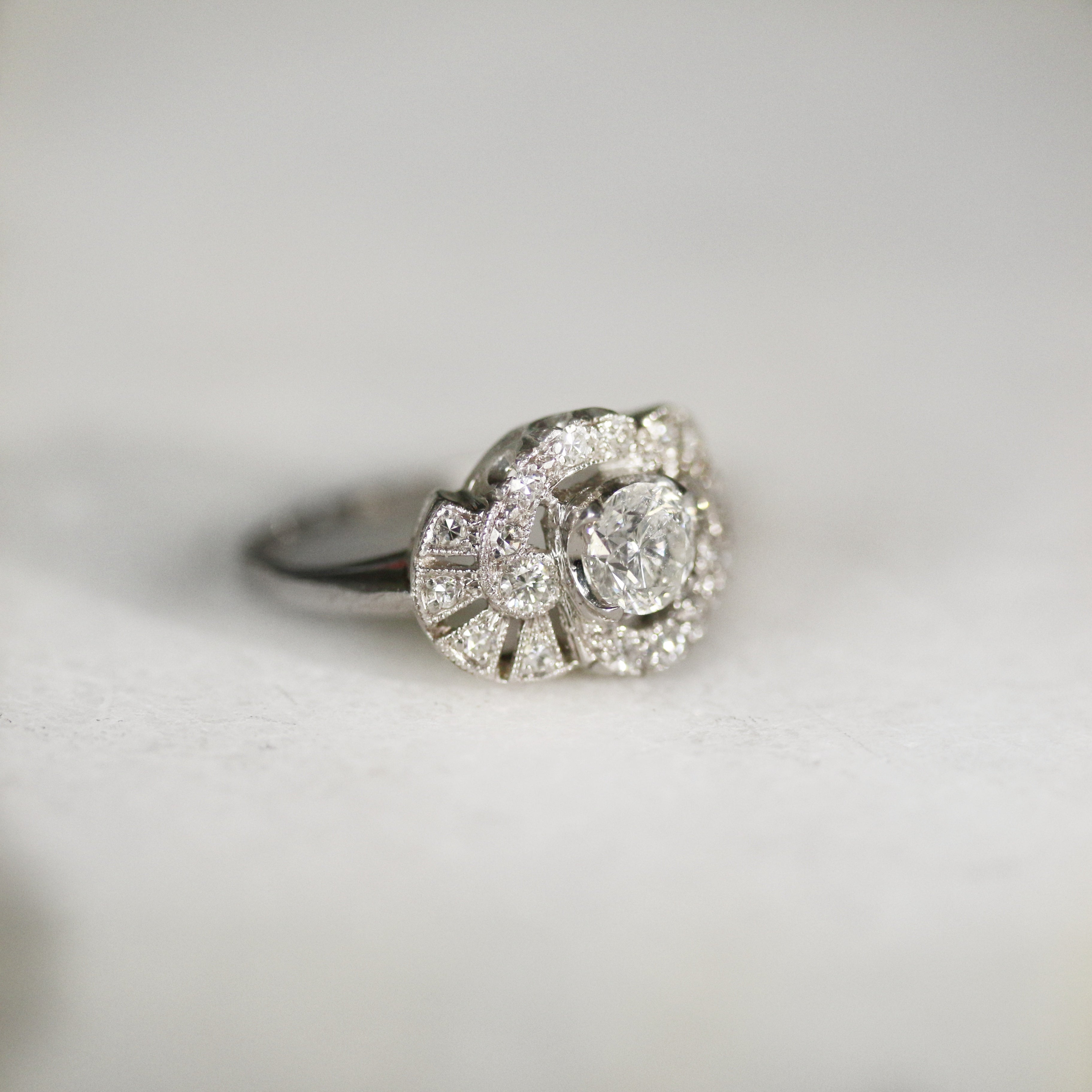 Elevate your jewellery collection with this exquisite platinum dress ring, where a stunning round brilliant diamond takes centre stage, beautifully framed by a sophisticated arrangement of complementary smaller diamonds. The intricate detailing creates a captivating sparkle that catches light from every angle, making this piece perfect for special occasions. Crafted in premium platinum for lasting durability and timeless appeal.