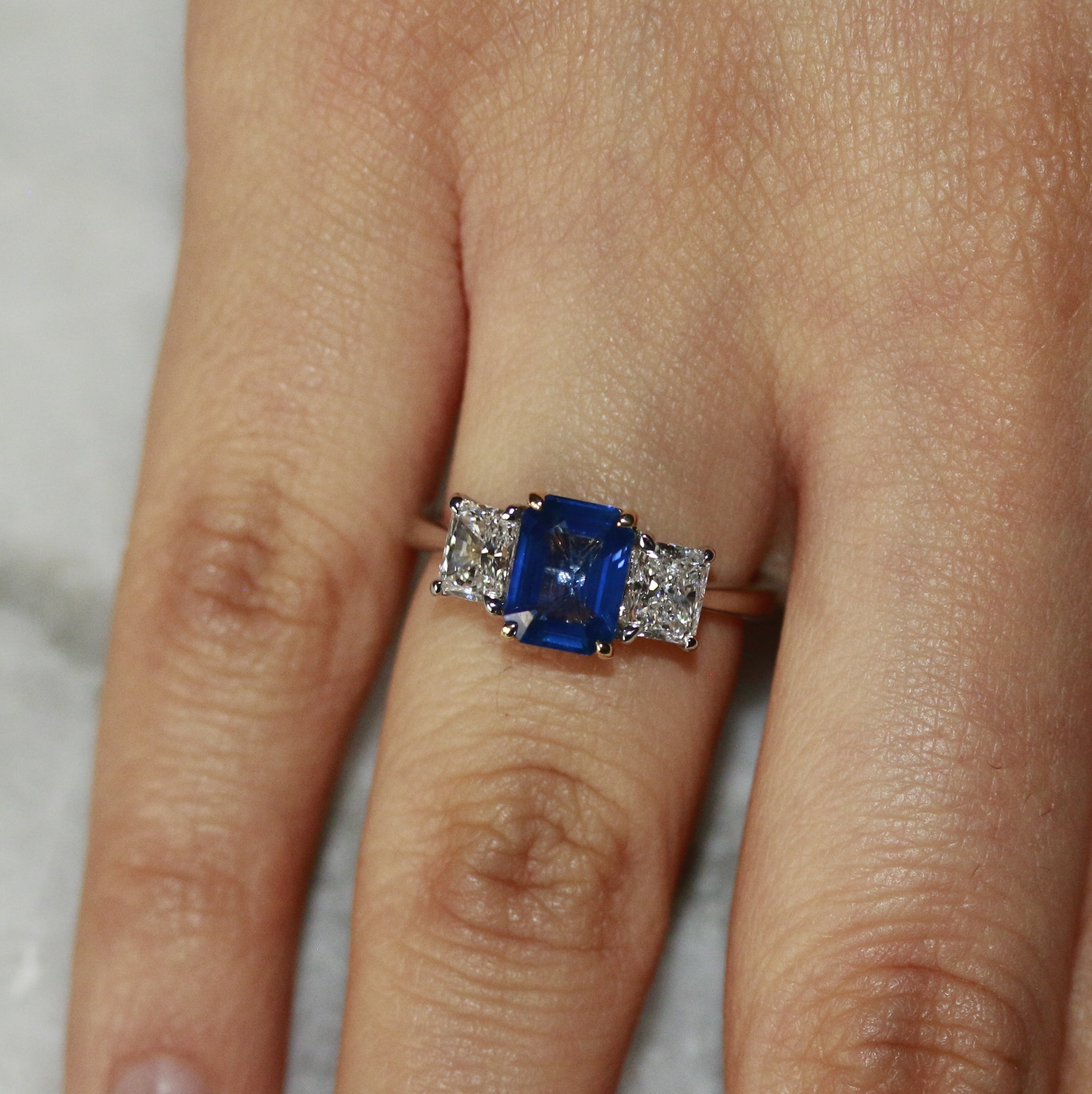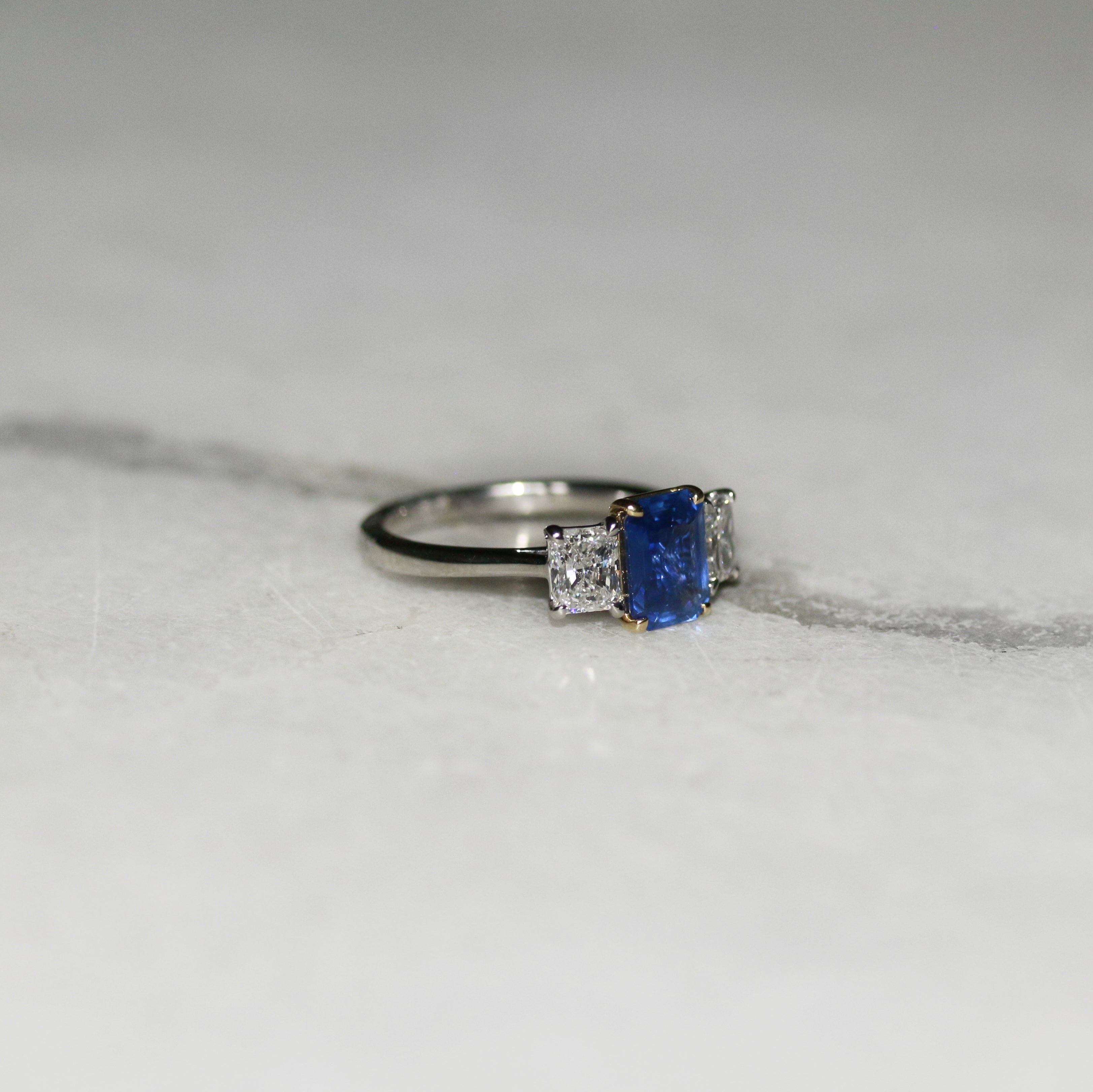 A striking three-stone design in platinum, this ring showcases a 2.00-carat emerald-cut sapphire as its centrepiece, flanked by two radiant-cut diamonds totalling 1.01 carats. The side stones are graded D colour and VS1 clarity, ensuring exceptional brilliance and purity. The emerald cut emphasises the sapphire's deep, saturated hue whilst the radiant cuts amplify the diamonds' sparkle. A sophisticated choice for those seeking a distinctive alternative to traditional solitaire designs.