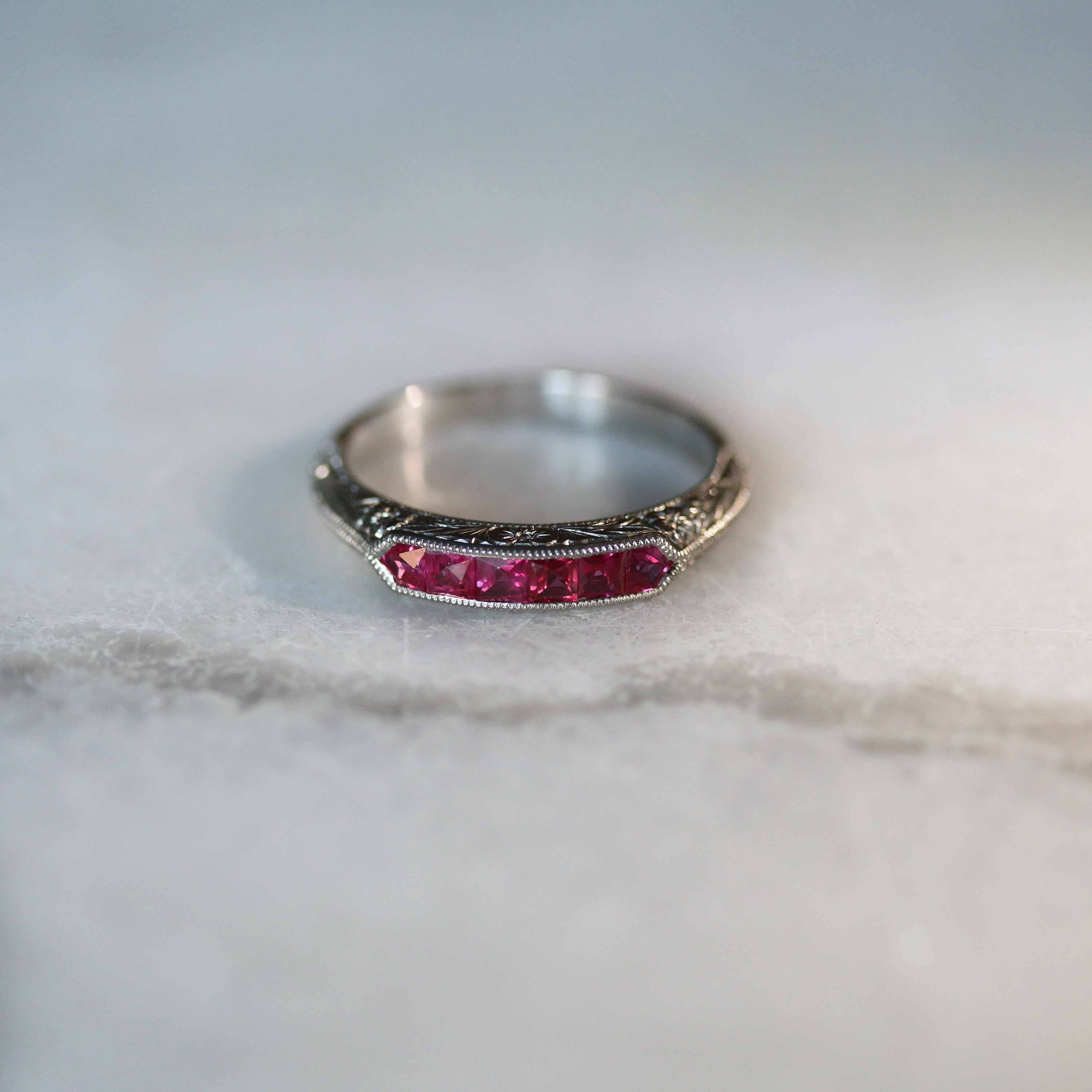 Discover timeless elegance with this exquisite platinum eternity ring, featuring six radiant rubies set in a sophisticated channel design. The ornate detailing elevates this piece into a statement of refined luxury, perfect for marking life's most precious moments or as an investment in enduring beauty.