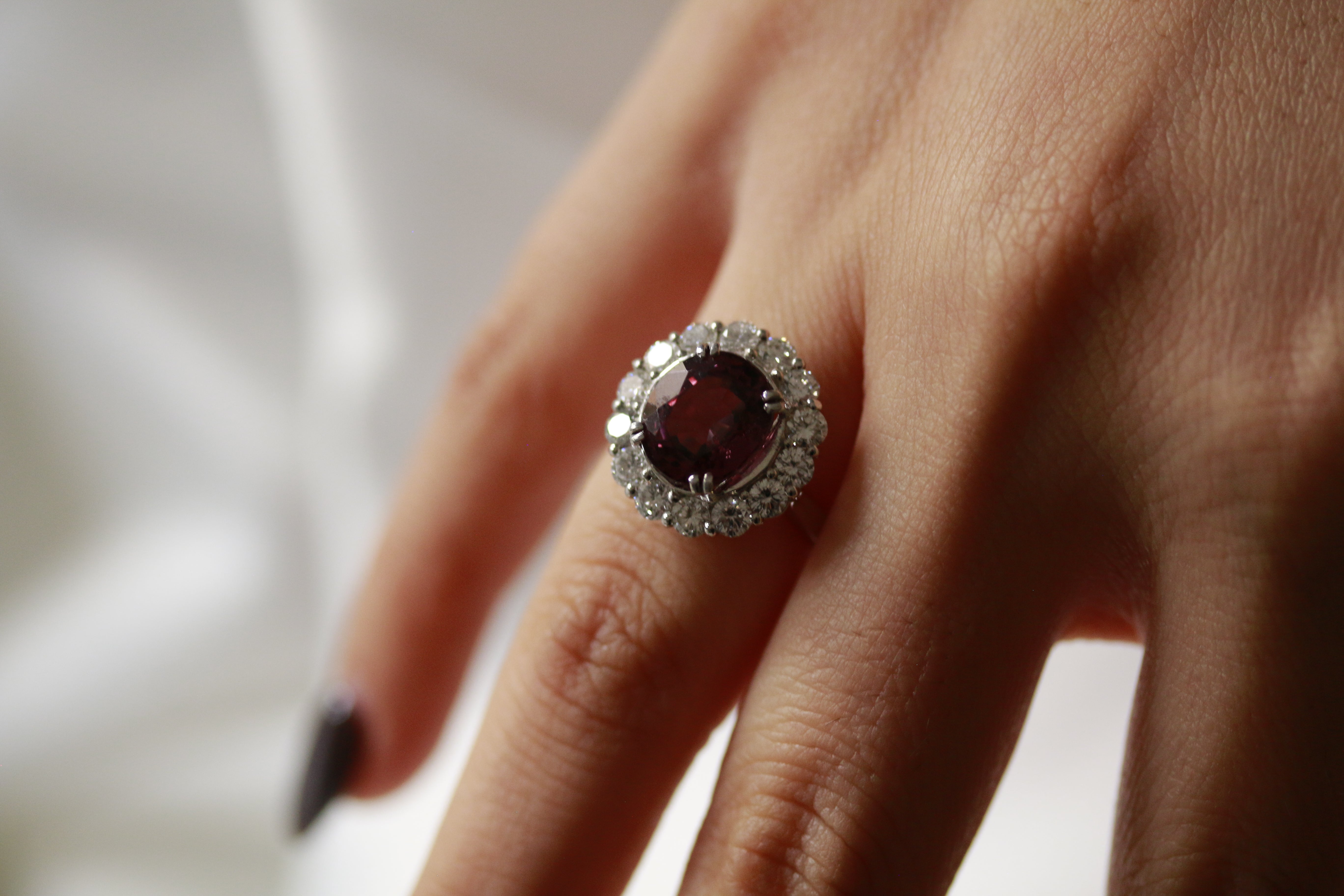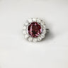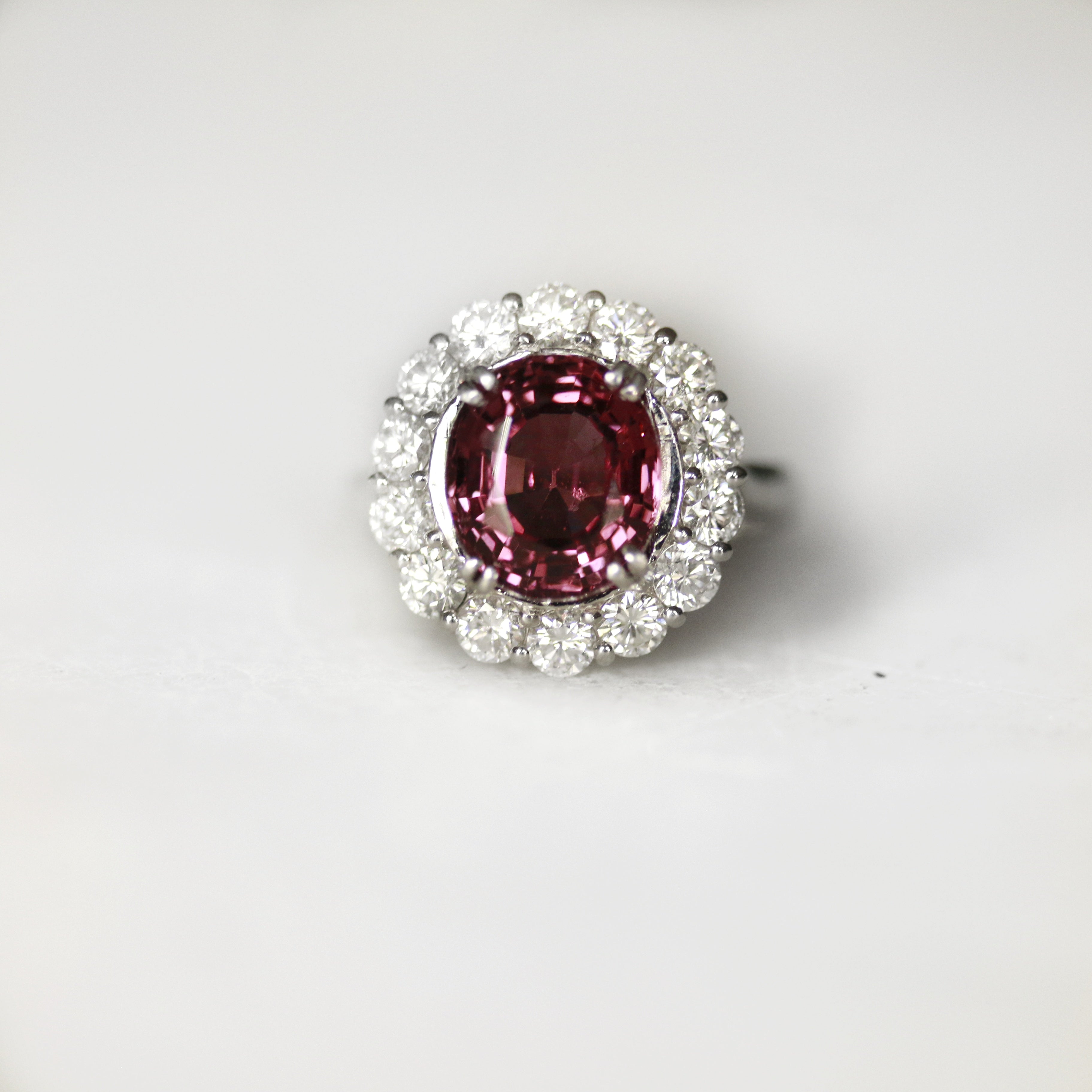 Discover timeless elegance with this exquisite platinum ring, featuring a stunning 4.14-carat spinel as its captivating centrepiece, surrounded by a brilliant halo of 1.20cts of diamonds. The perfect blend of luxury and sophistication, this cluster design showcases exceptional craftsmanship and enduring beauty that will elevate any occasion.