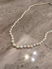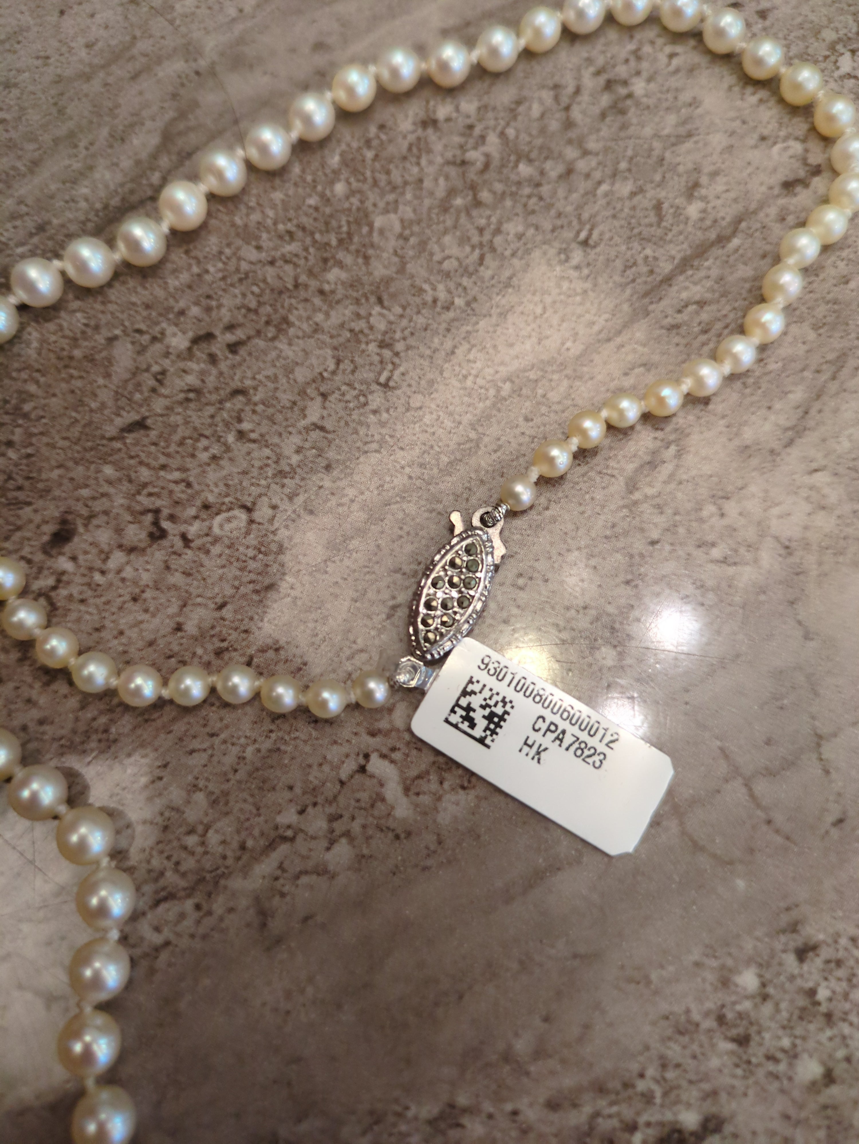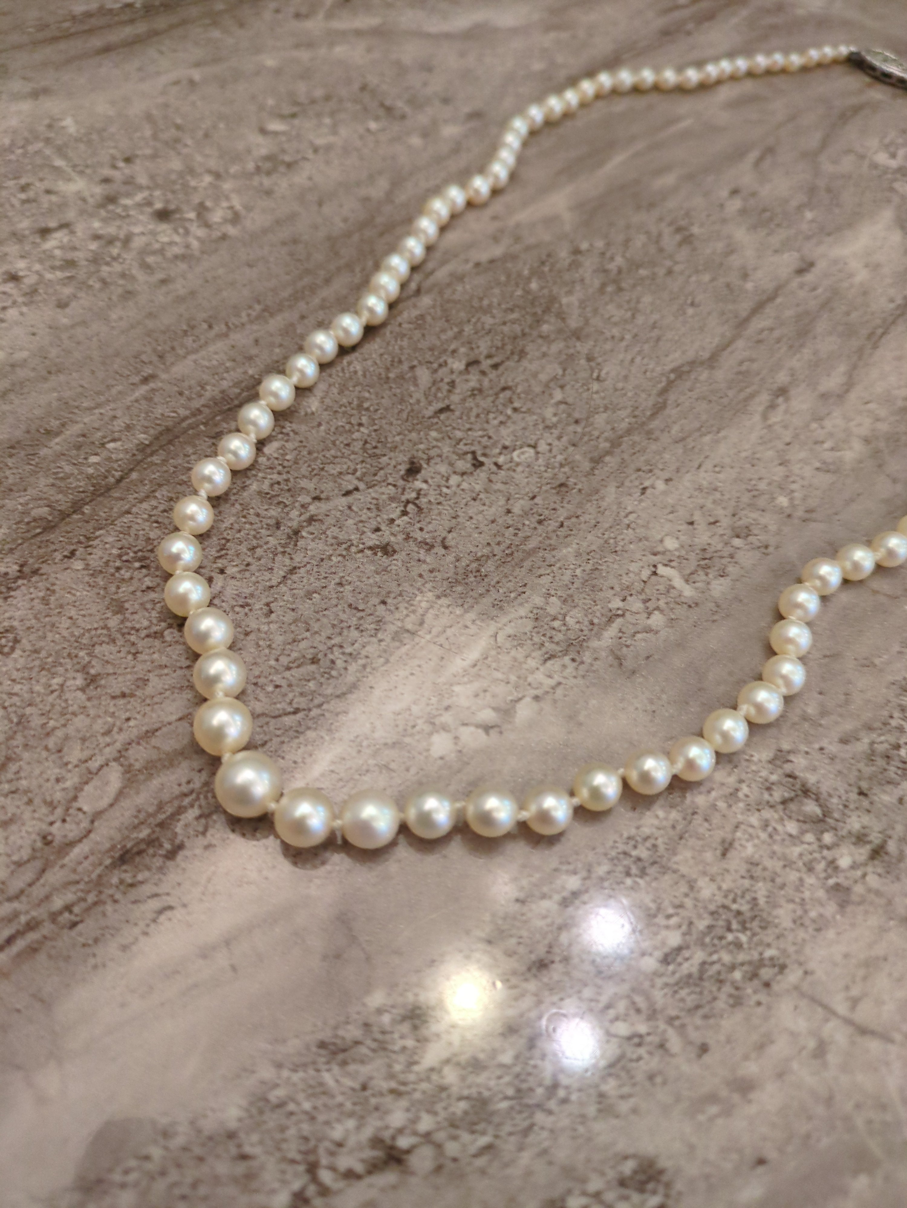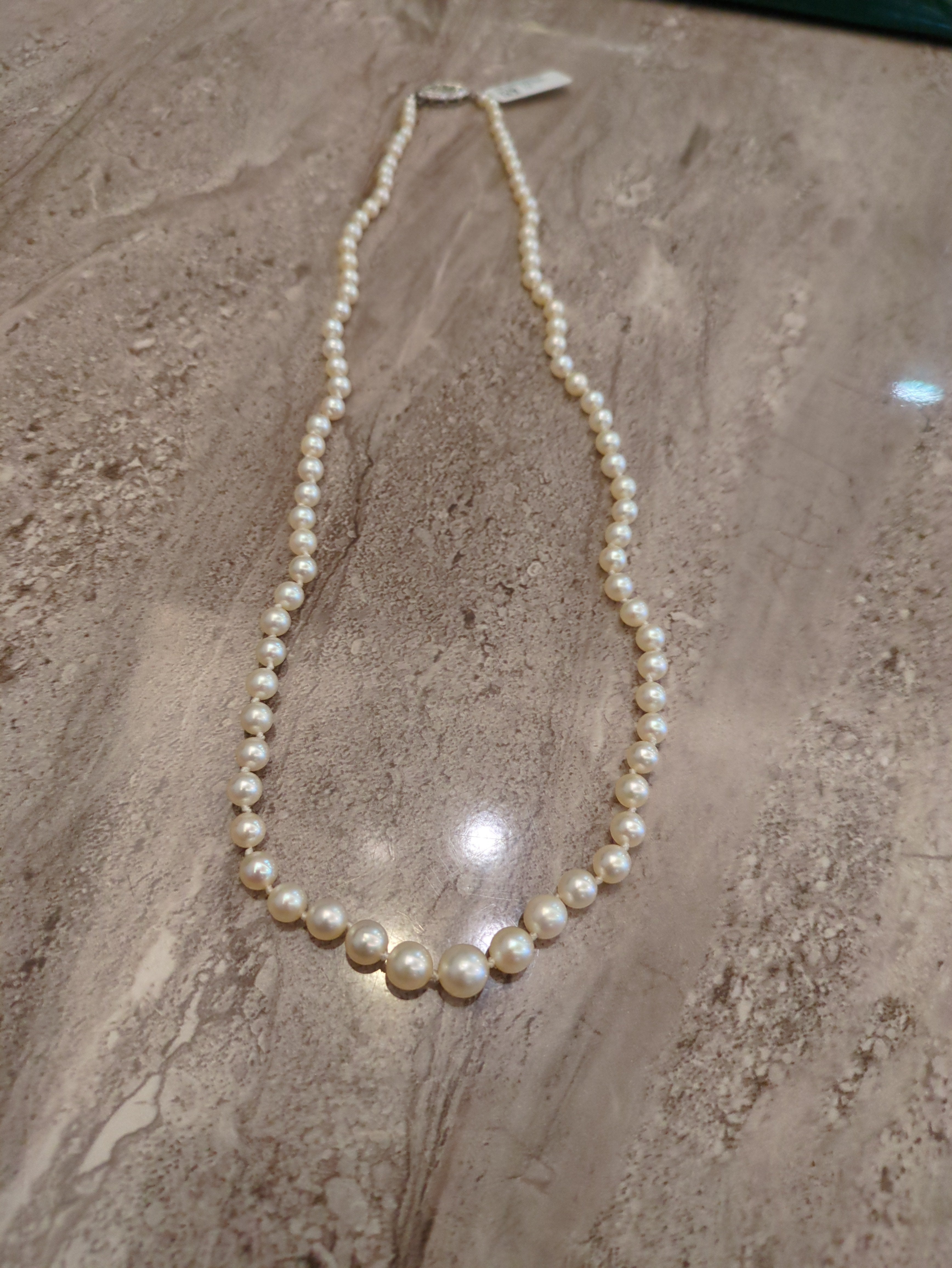 Silver graduated white cultured pearl necklace 19" with silver and marcasite clasp.
