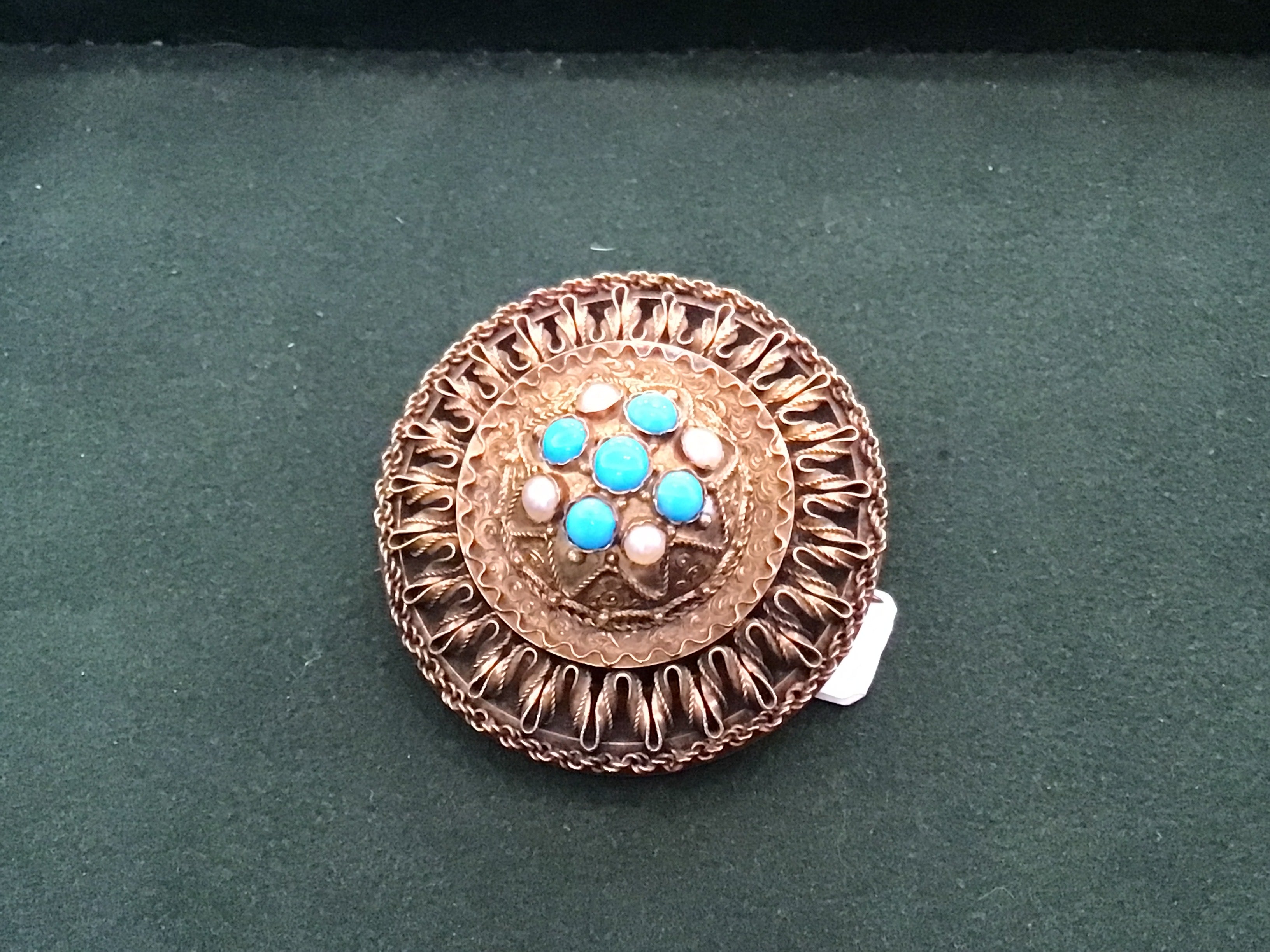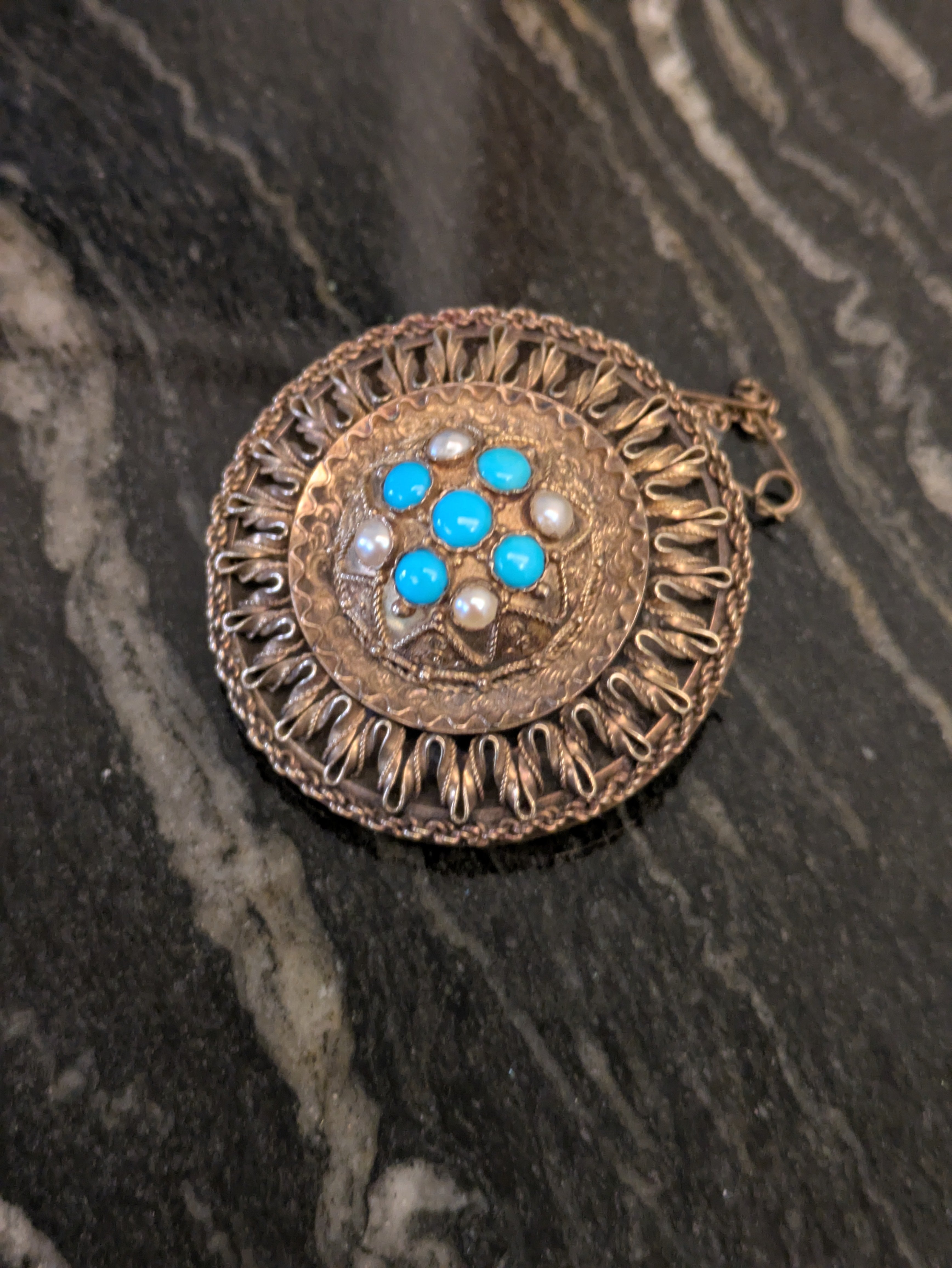 A yellow gold Turquoise and Pearl brooch with ornate detailing.